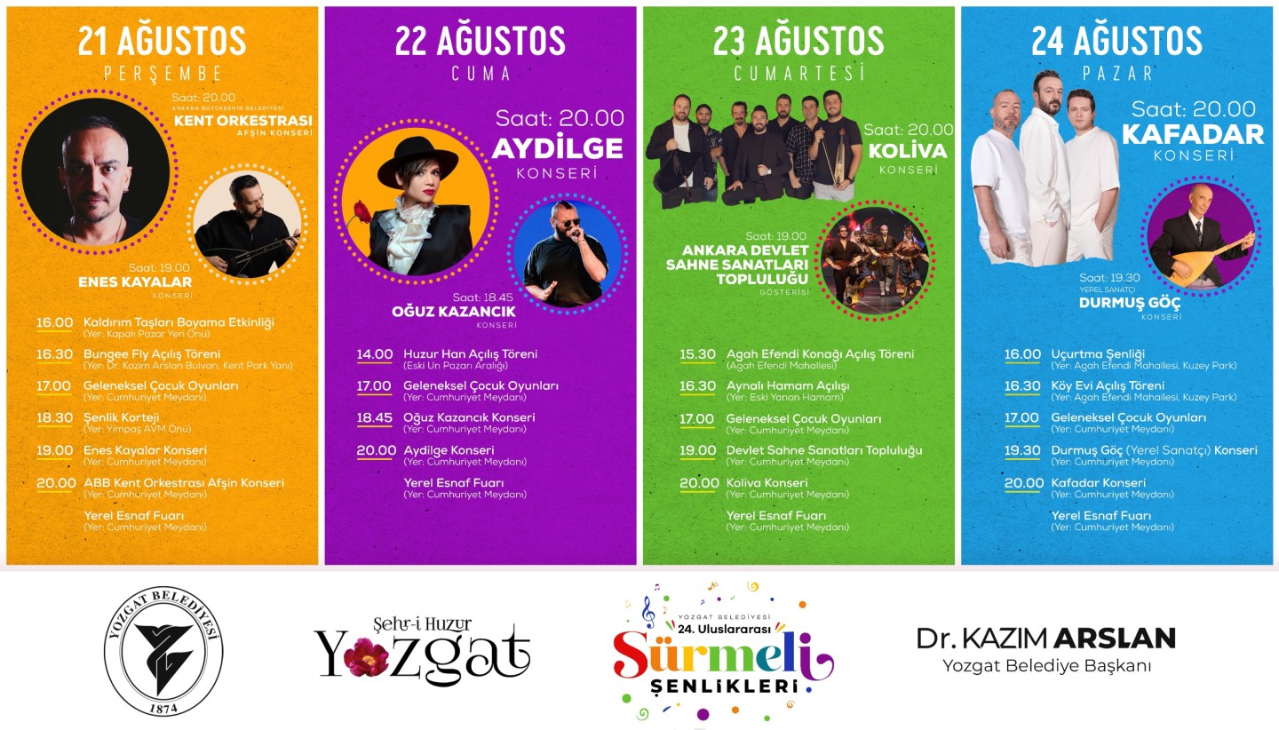 Şenlikler kapsamında gündüz saatlerinde özellikle çocuklara yönelik geleneksel oyunlar, yarışmalar ve eğlenceli aktiviteler düzenlenecek. Akşamları ise sahne alacak sanatçılar ve müzik gruplarıyla unutulmaz konserler izleyicilerle buluşacak. Her akşam bir yerel sanatçı ve bir profesyonel müzik grubunun sahne alacağı konser programlarıyla Yozgatlılar dolu dolu bir eğlence deneyimi yaşayacak.