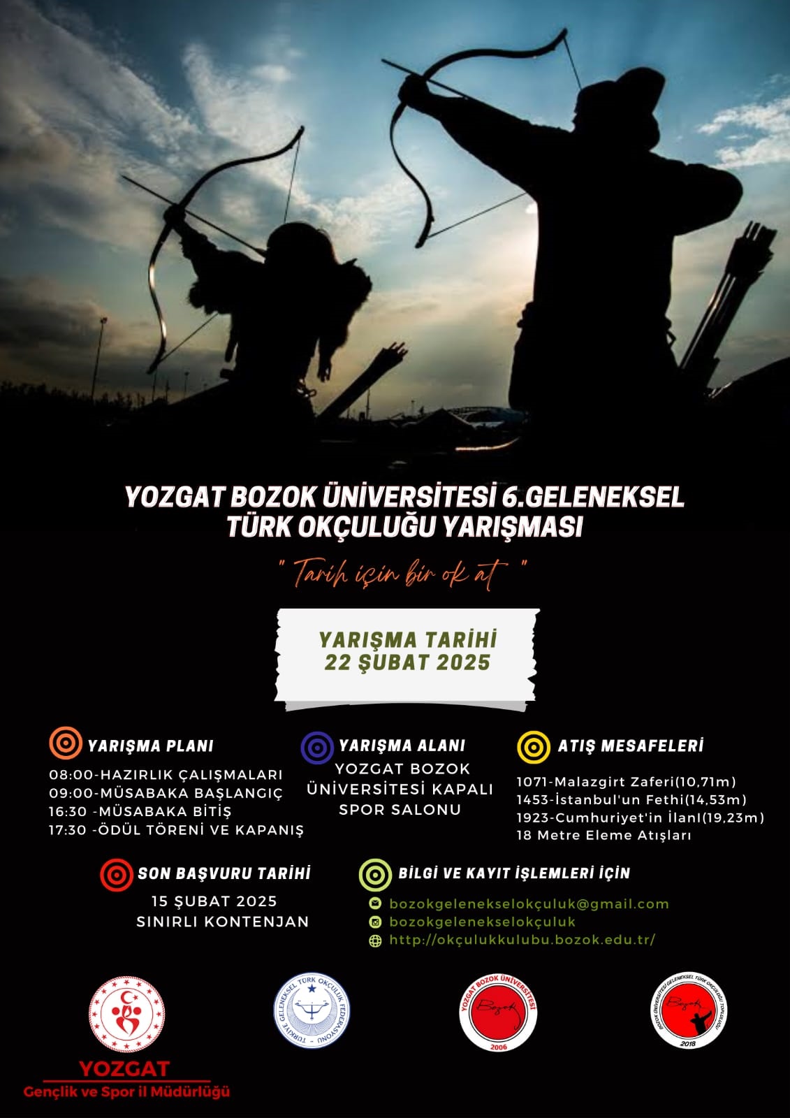 Yozgat Bozok Üniversitesi, Türk okçuluğuna olan ilgiyi artırmak ve geleneksel sporları yaşatmak amacıyla 6. Geleneksel Türk Okçuluğu Yarışması’nı düzenliyor. Yarışma, 22 Şubat Cumartesi günü saat 09.30’da Bozok Üniversitesi Kapalı Spor Salonu’nda yapılacak.