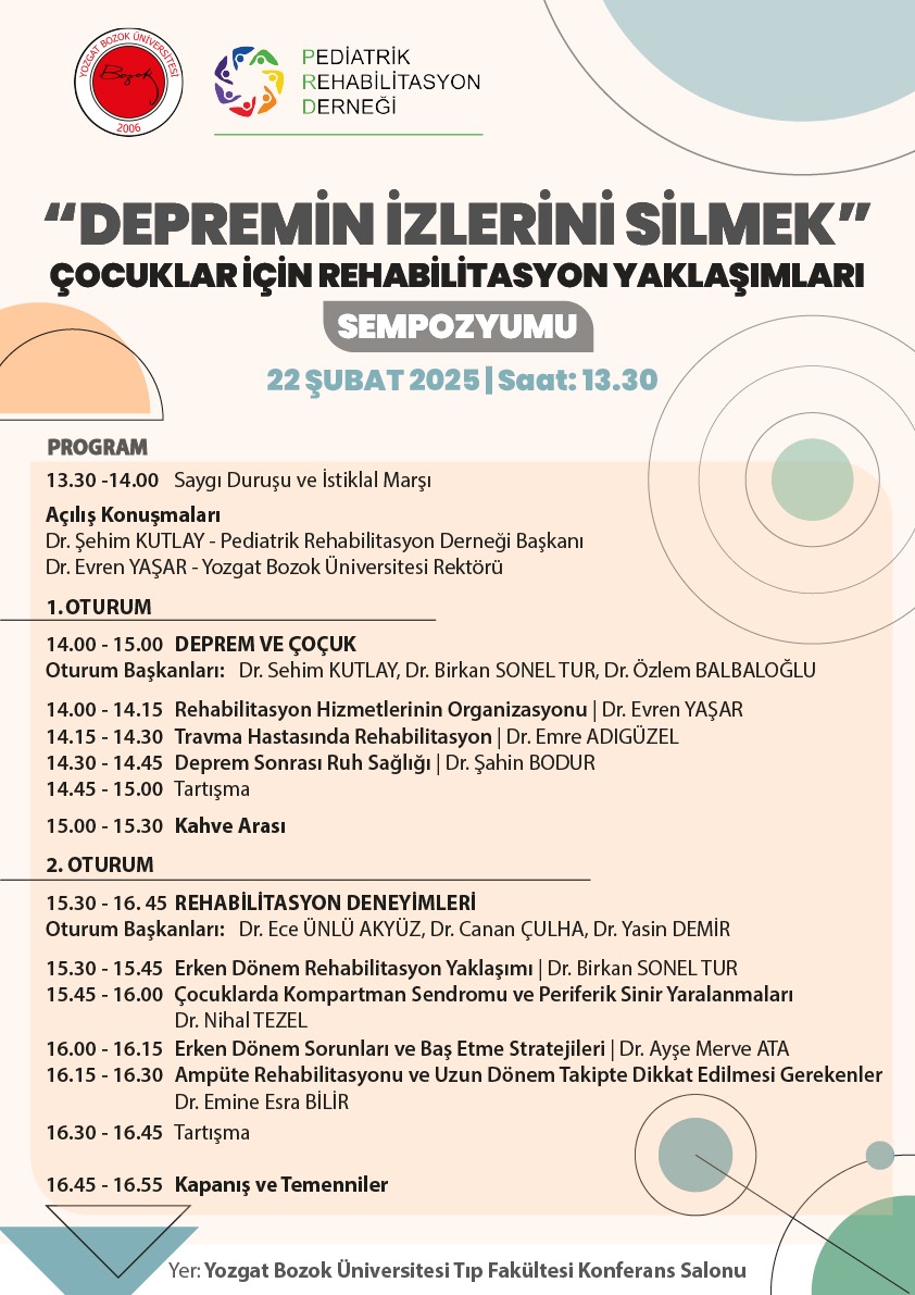 Yozgat’ta ayrıca, depremzedeler için çok önemli bir sempozyum düzenlenecek. 22 Şubat Cumartesi günü saat 13.30’da Tıp Fakültesi Konferans Salonu’nda, “Depremin İzlerini Silmek: Çocukların İçin Rehabilitasyon Yaklaşımları” konulu sempozyum gerçekleştirilecek. Sempozyumda, depremden etkilenen çocukların psikolojik ve fizyolojik rehabilitasyonu için geliştirilen yaklaşımlar ele alınacak.