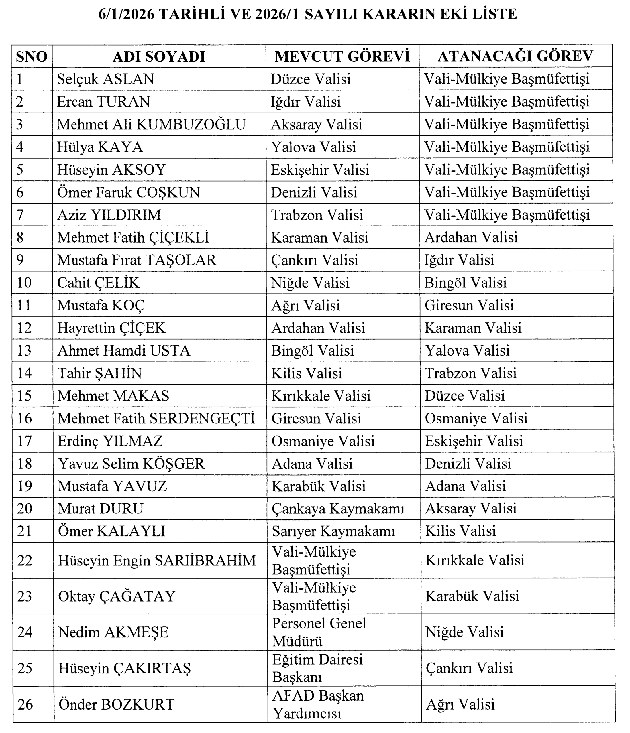 Kararname kapsamında birçok ilde valiler yer değiştirirken, bazı illere ise yeni isimler atandı. Buna göre;