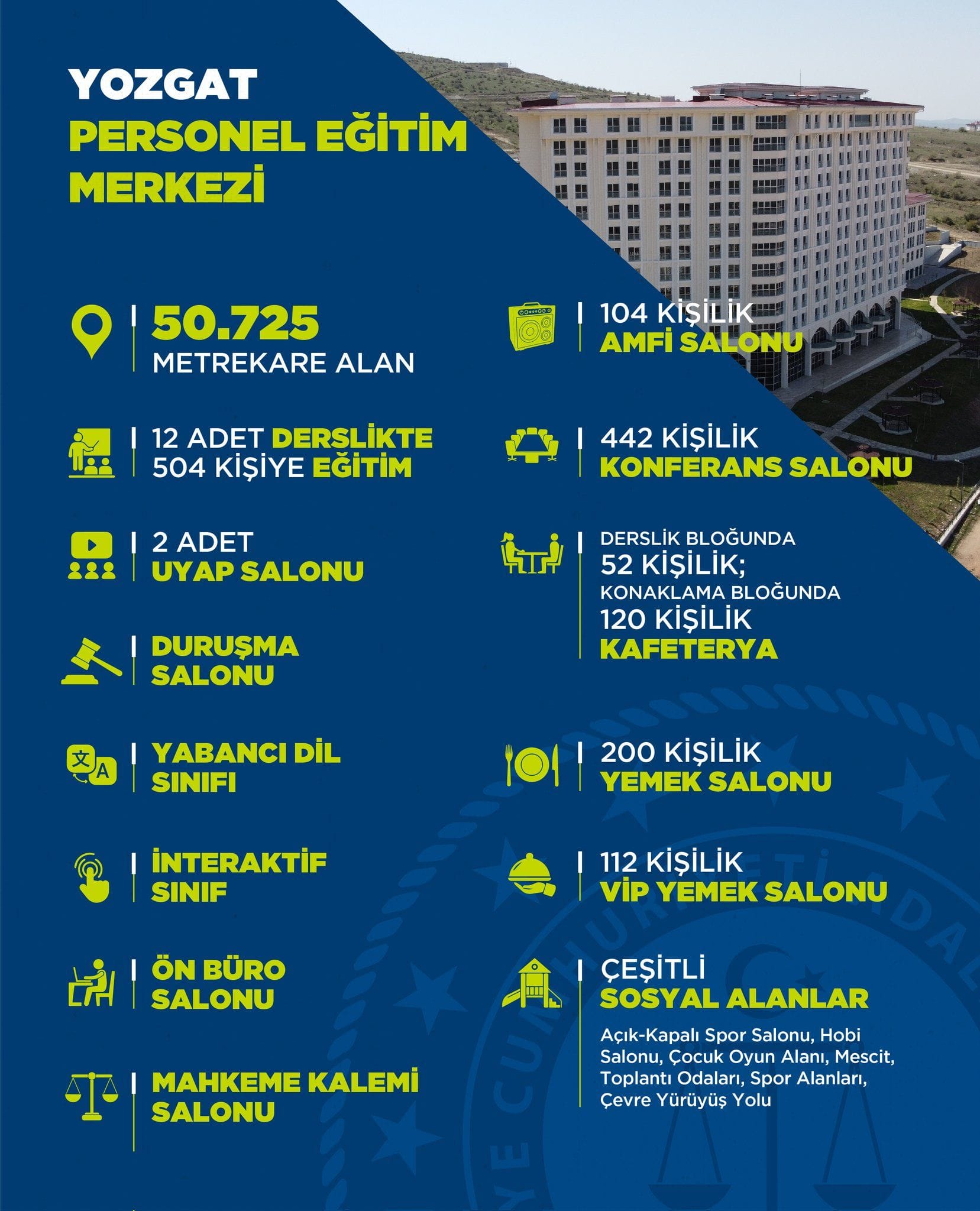 Yozgat’ta 50 bin 725 metrekare alan üzerine inşa edilen tesisteki, 12 derslikle aynı anda 504 kişiye eğitim verilebiliyor. Eğitim tesisinde 104 kişilik amfi salon, 442 kişilik konferans salonu, yabancı dil sınıfı ve interaktif sınıf bulunuyor. Merkezde ayrıca personelin mesleğe yönelik pratiklerinin geliştirilmesi için UYAP, duruşma, ön büro, mahkeme salonu da yer alıyor. Kütüphanenin de bulunduğu merkezde, spor etkinlikleri için de sosyal alanlar da yer alıyor.