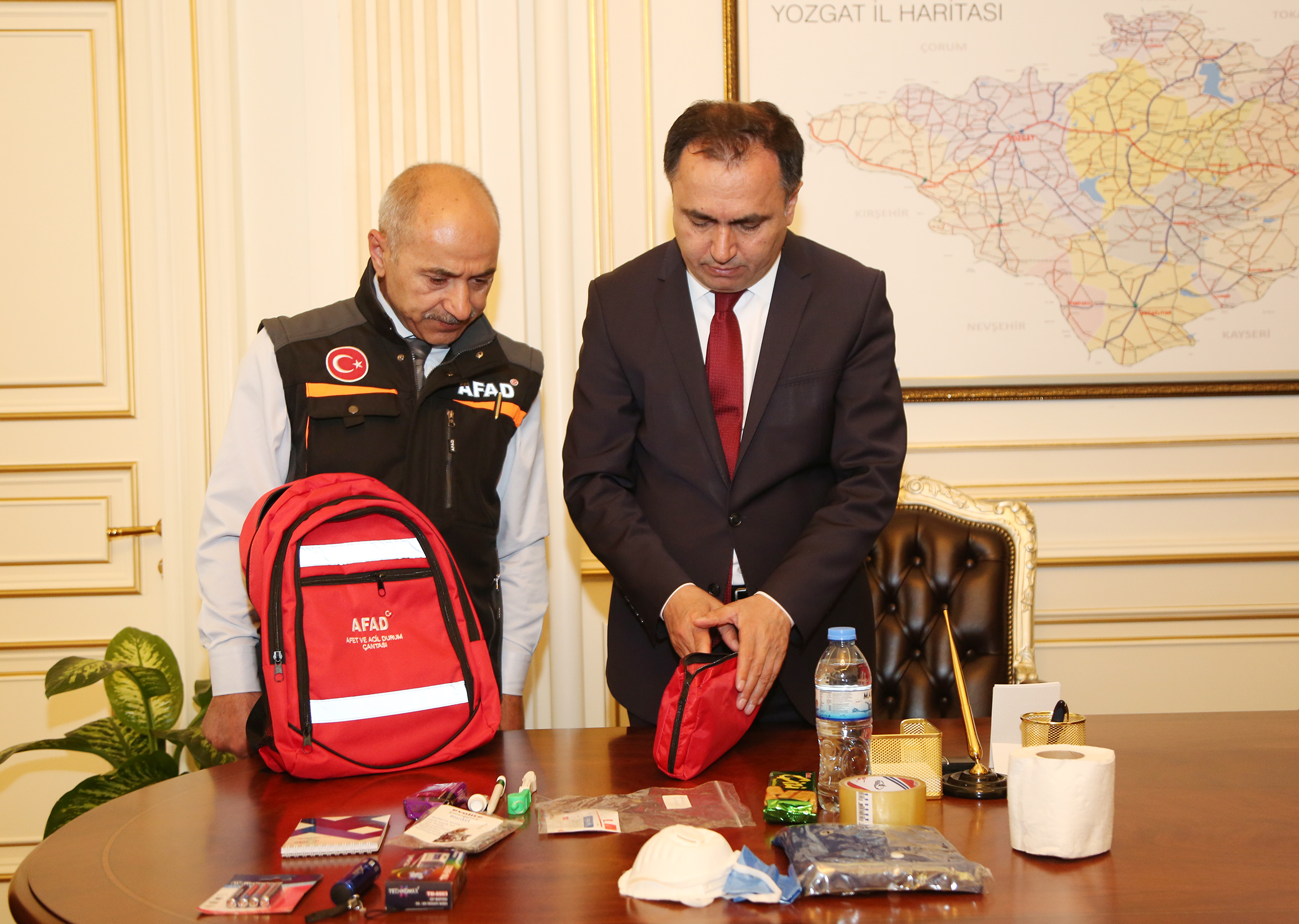 İçişleri Bakanlığı AFAD tarafından belirlenen “Afetlere Hazırlık Yılı” kapsamında Eylül ayı etkinliği olarak, İl AFAD Müdürü H. İbrahim İbiş tarafından Vali Kadir Çakır’a afet ve acil durum çantası takdim edildi.
