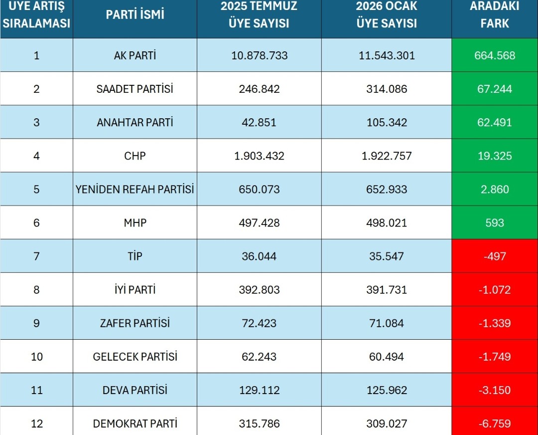Muhalefet partileri arasında ise üye artışında Saadet Partisi ilk sırada yer aldı. Saadet Partisi’nin üye sayısı 246 bin 842’den 314 bin 86’ya çıkarak 67 bin 244 kişilik artış gösterdi. Anahtar Parti de dikkat çeken bir yükseliş yaşayarak, üye sayısını 42 bin 851’den 105 bin 342’ye yükseltti ve 62 bin 491 yeni üye kazandı.