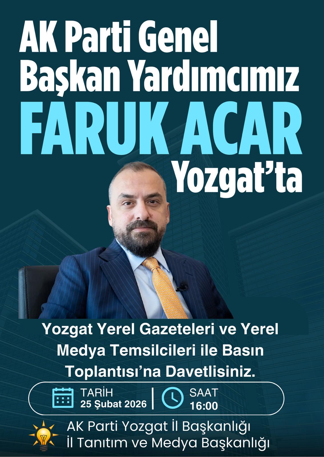AK Parti Tanıtım ve Medya Başkanı Faruk Acar, 25 Şubat Çarşamba günü bir dizi ziyaret ve programlara katılmak üzere Yozgat’a geliyor. AK Parti’de Tanıtım ve Medya Başkanı olarak görev yapan Acar’ın programı kapsamında parti teşkilatı ve yerel basın temsilcileriyle bir araya gelmesi planlanıyor.