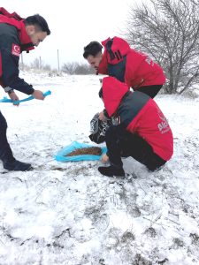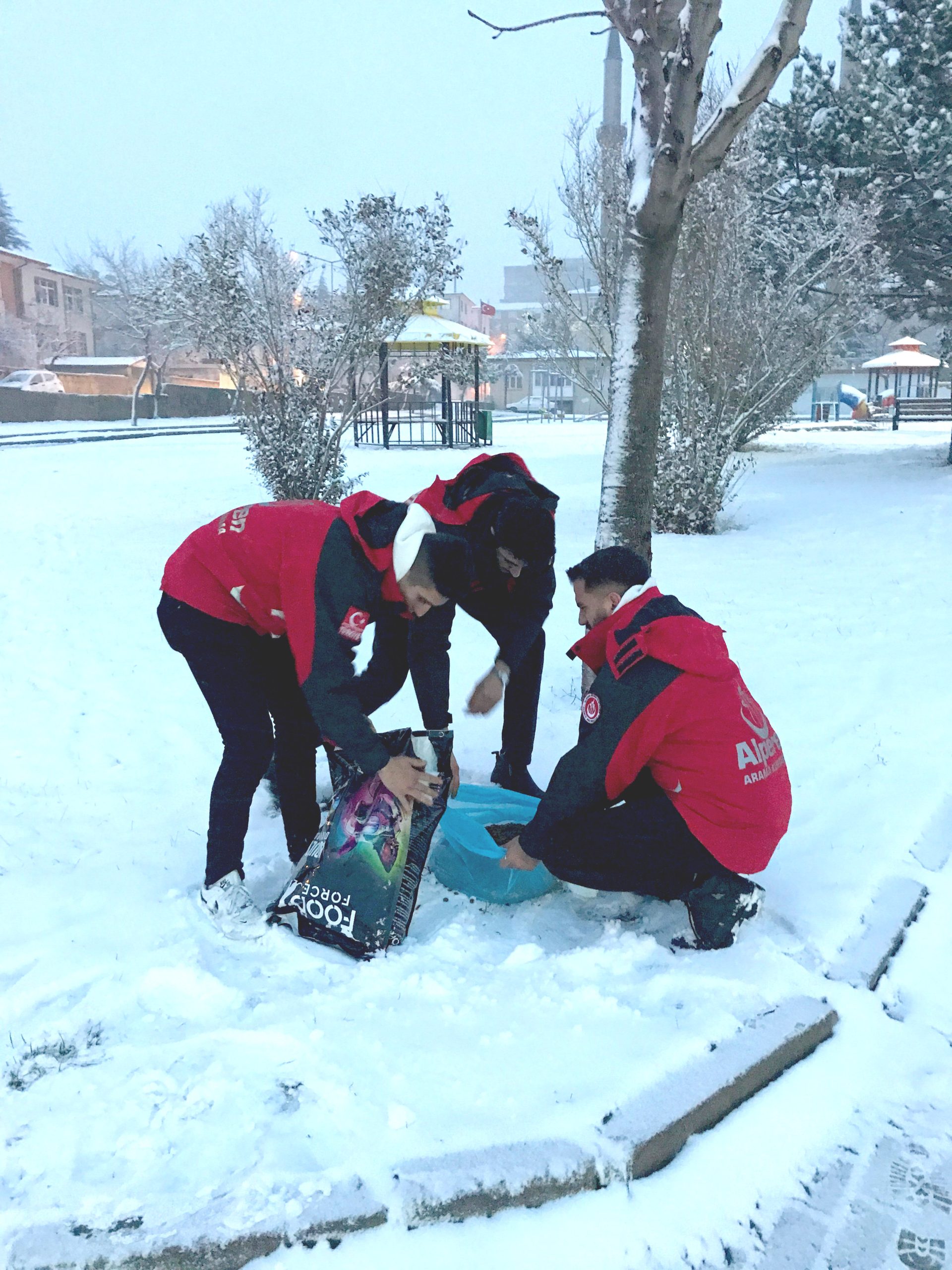 Yozgat Alperen Ocakları İl Başkanı Mücahit Kaplan, karla kaplı alanda yiyecek bulmakta güçlük çeken sokak hayvanları için belli bölgelere mama bıraktı.
