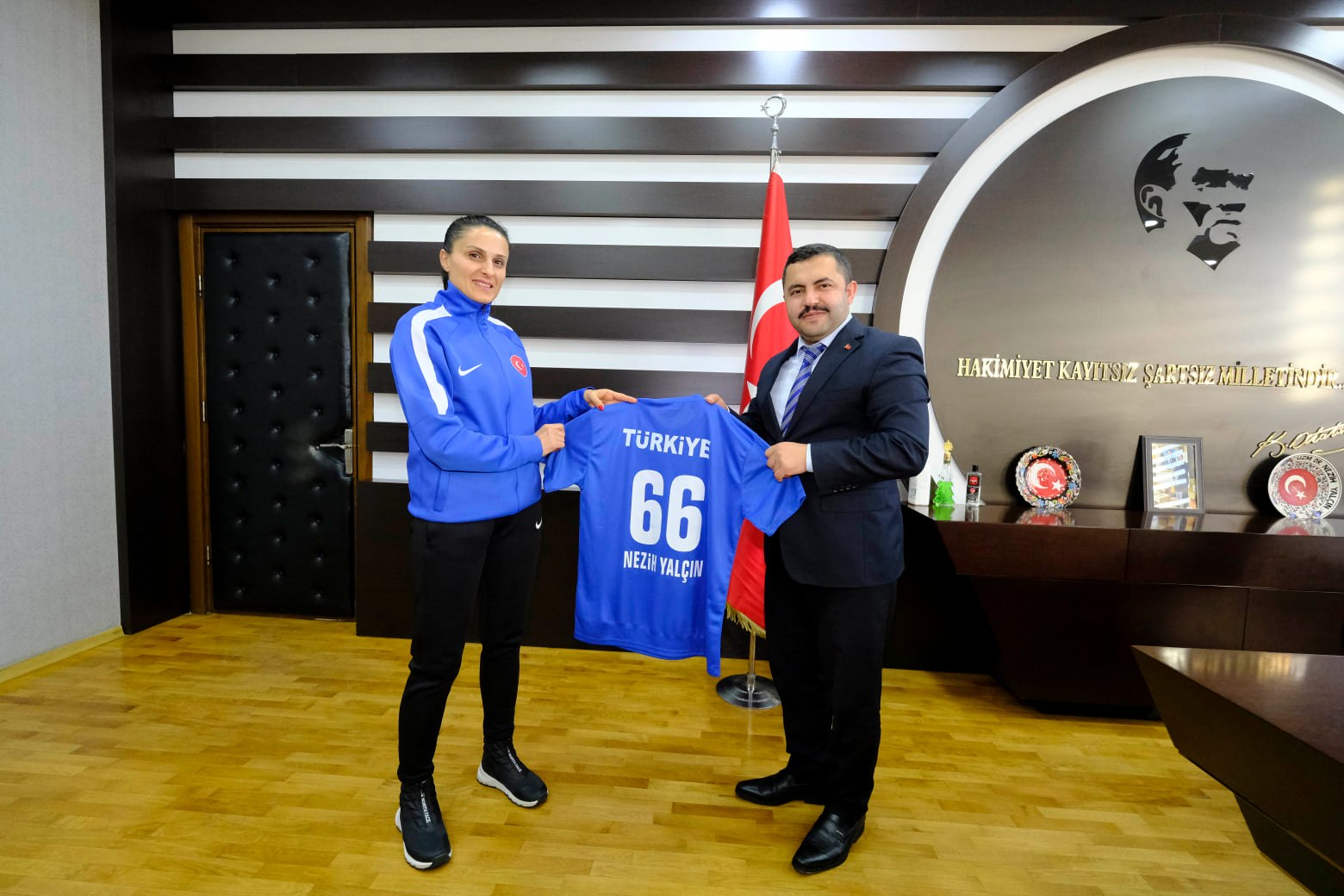 Baş antrenör Ertan Özkan ve antrenörler Başkan Yalçın’a Milli Takım forması hediye ederken destekleri içinde Türkiye İşitme Engelliler Spor Federasyonu Başkanı Kerim Vural’ın teşekkür plaketini takdim etti. Alpaslan DEMİR