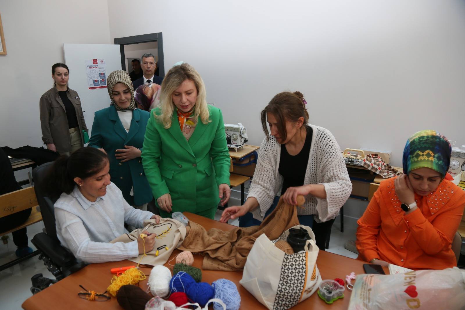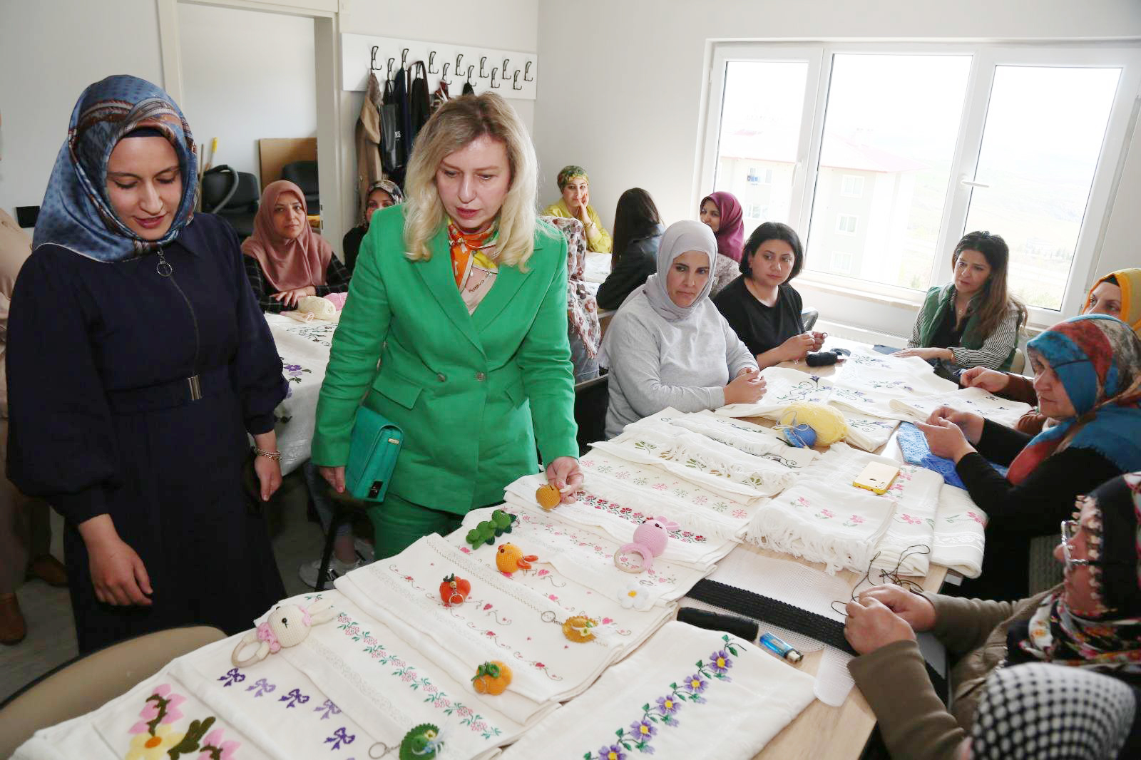 Merkezlerde düzenlenen çeşitli mesleki ve beceri kurslarına katılan kadınlarla bir araya gelen Arzu Özkan, kursiyerlerle samimi sohbetler gerçekleştirdi. Kadınların el emeğiyle hazırladığı ürünleri tek tek inceleyen Özkan, emeklerinden dolayı tüm kursiyerleri tebrik etti ve başarılar diledi.