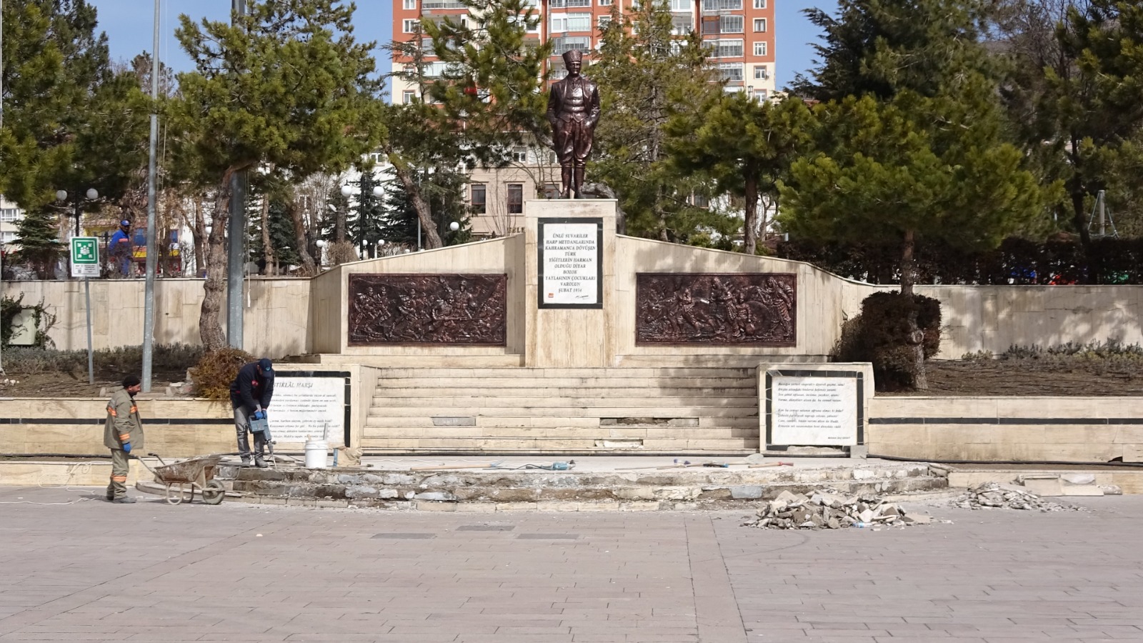 Yozgat Belediyesi Fen İşleri Müdürlüğü ekipleri, Atatürk heykeli etrafında yoğun kış şartları nedeniyle zamanla zarar gören merdiven basamaklarını onarıma aldı. Heykel etrafındaki kırılan ve dökülen basamaklar onarılarak çevresinde de ilkbahar mevsimiyle birlikte peyzaj çalışması yapılacak.