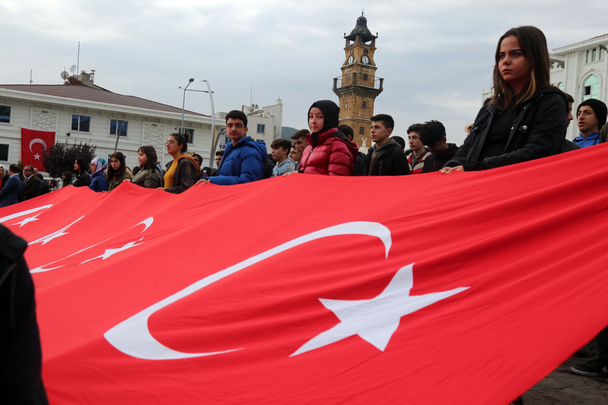 Cumhuriyet Meydanı’ndaki tören, Atatürk Anıtı’na çelenk bırakılmasıyla başladı.