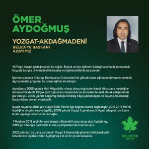 Gelecek Partisi Yozgat İl Başkanı Ömer Aydoğmuş, adaylığının ilan edilmesinin ardından, “Edebin, adabın, ahlakın ve şeffaflığın egemen olduğu bir yönetim anlayışı içinde, ekip ruhuyla çalışan, özü sözü bir hikaye yazmaya geliyorum” ifadelerini kullandı.