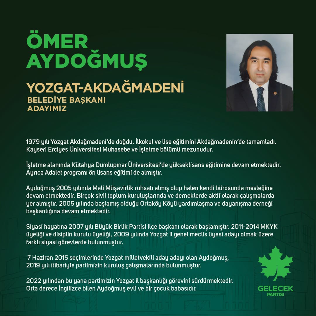 Gelecek Partisi Akdağmadeni Belediye Başkan Adayı Ömer Aydoğmuş, yaptığı açıklamada, “Gelecek Partisi Genel Merkezinde yapılan aday tanıtım programında, Genel Başkanımız Ahmet Davutoğlu tarafından Akdağmadeni Belediye Başkan Adaylığım açıklanmıştır. Bu vesileyle şahsıma göstermiş olduğu takdir ve güvenden dolayı başta 62., 63., 64. Hükümetlerin Başbakanı ve Genel Başkanımız Ahmet Davutoğlu olmak üzere, Yerel Yönetimler ve Şehircilik Başkanımız Hasan Hüseyin Bozok, Teşkilat Başkanımız Ömer Ünal ile Genel Merkez Yöneticilerimize ve Yozgat teşkilatımıza teşekkür ediyorum” dedi.
