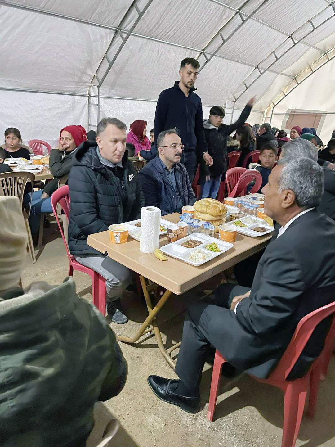 Asrın felaketi olarak nitelendirilen Kahramanmaraş merkezli meydana gelen deprem felaketlerinin ardından Hatay’ın Hassa ilçesine görevlendirilen Yozgat Valisi Ziya Polat, Yozgat ve Sarıkaya Belediye başkanları ile birlikte İçişleri Bakan Yardımcısı İsmail Çataklı’yı misafir ettiler. Sarıkaya Belediyesi tarafından kurulan iftar çadırına misafir olan Çataklı, Yozgat il yöneticileri ve vatandaşlarla orucunu açtı. Yozgat Belediye Başkanı Celal Köse, ‘’İçişleri Bakan Yardımcımız İsmail Çataklı beyefendi ile birlikte Deprem Bölgesi’nde Sarıkaya Belediyemiz tarafından kurulan iftar çadırımızda vatandaşlarımızla beraber iftarımızı yaptık. Gönüllerimizde soframızda bir. Yüce Mevla’m birlik ve beraberliğimizi daim eylesin’’ dedi.