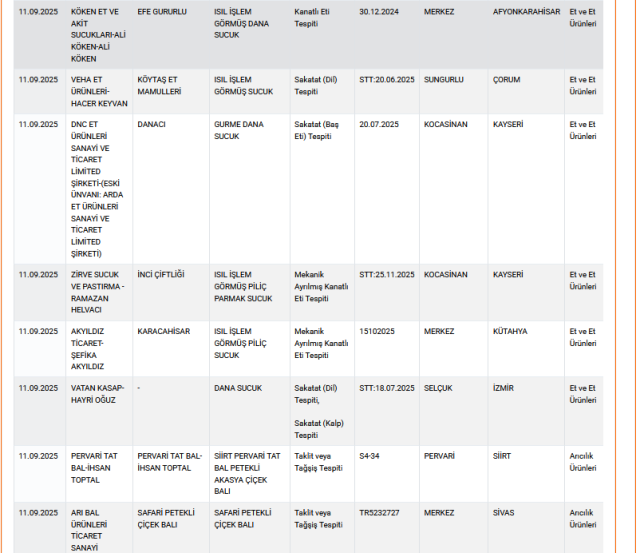 Denetimler sonucunda bazı markalara ait dana sucuklarda sakatat ve kanatlı eti, peynirlerde nişasta ve bitkisel yağ, ballarda ise taklit ve tağşiş tespit edildi. Bakanlık, uygunsuz ürünleri ifşa ederek vatandaşları uyardı.