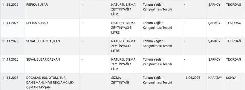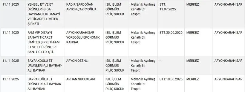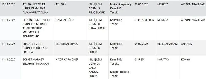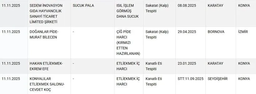 Güncellenen listede dikkat çeken örnekler arasında Konya’daki bir lokantada satılan etli ekmekte kanatlı et tespit edilirken, İzmir’deki bir pidecideki pide harcında kalp eti bulunduğu belirtildi. Bakanlık, bu tür durumlarda işletmelere yasal işlemler uygulayarak, tüketicilerin güvenli gıda tüketimini sağlıyor.