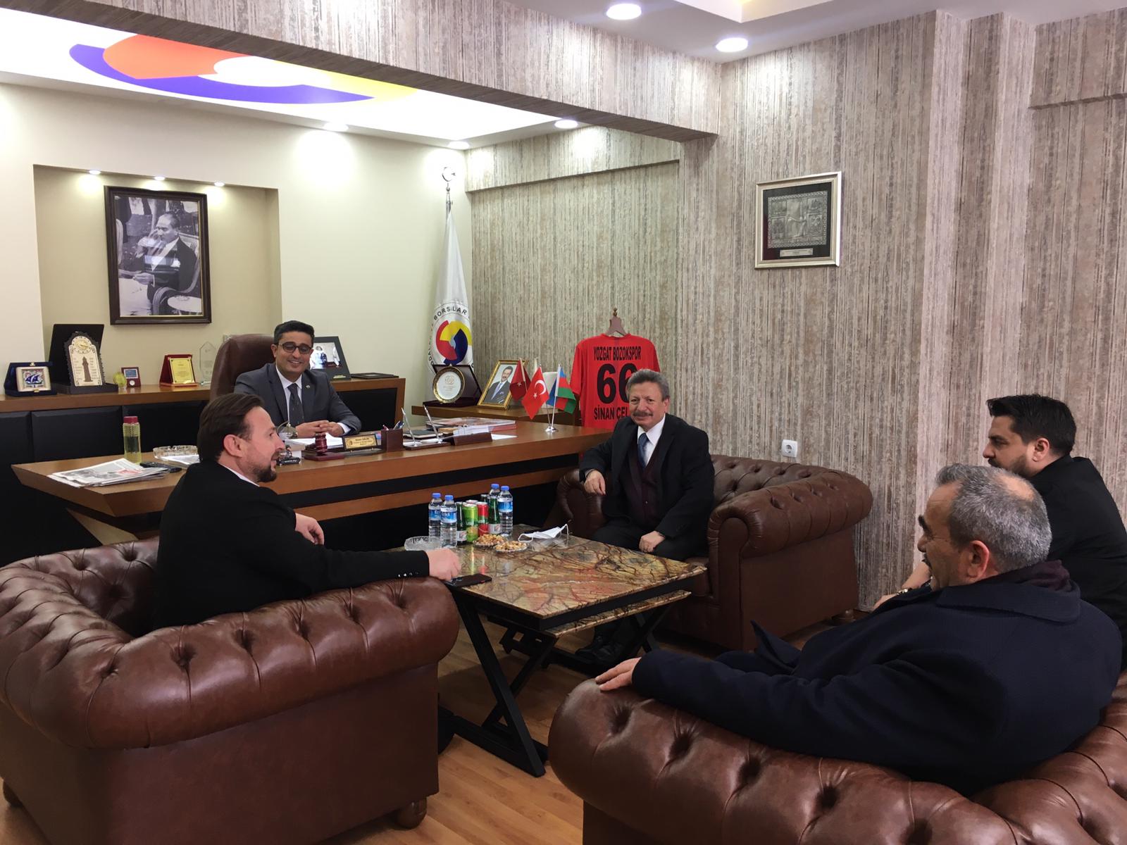 İl Başkanı Yusuf Başer, stk ziyaretleri kapsamında; Yozgat Ticaret ve Sanayi Odası Başkanı Başkanı Sinan Çelik, Yozgat Esnaf ve Sanatkarlar Kredi Kefalet Kooperatifi Başkanı Uğur Bektaş, Memur Sen Yozgat Şube Başkanı Kenan Şerefli, Bozok Esnaf Sanatkarlar Kredi ve Kefalet Kooperatifi Başkanı Şenol Ayaroğlu, Yozgat Kahveciler ve Lokantacılar Odası Başkanı Coşgun ve Ticaret Borsası Başkanı Mehmet Erkekli’yi makamlarında ziyaret etti.