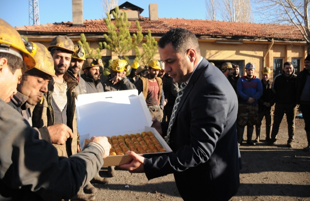 Madencilere, kazasız sağlıklı günler dileğinde bulunan Başkan Ekinci, madencilerle tek tek tokalaşarak günlerini kutladı ve baklava ikram etti.