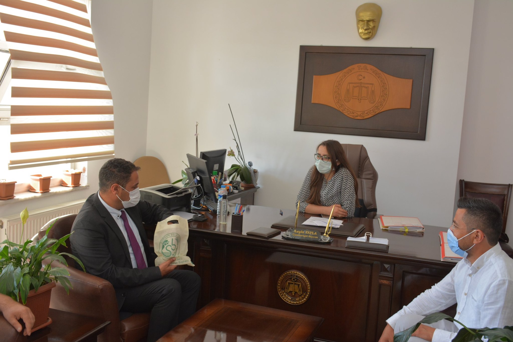 Başkan Ekinci, ziyarette üretimi belediye tarafından yapılan dezenfektan ve maskelerden oluşan paketleri adliye çalışanlarına hediye etti.
