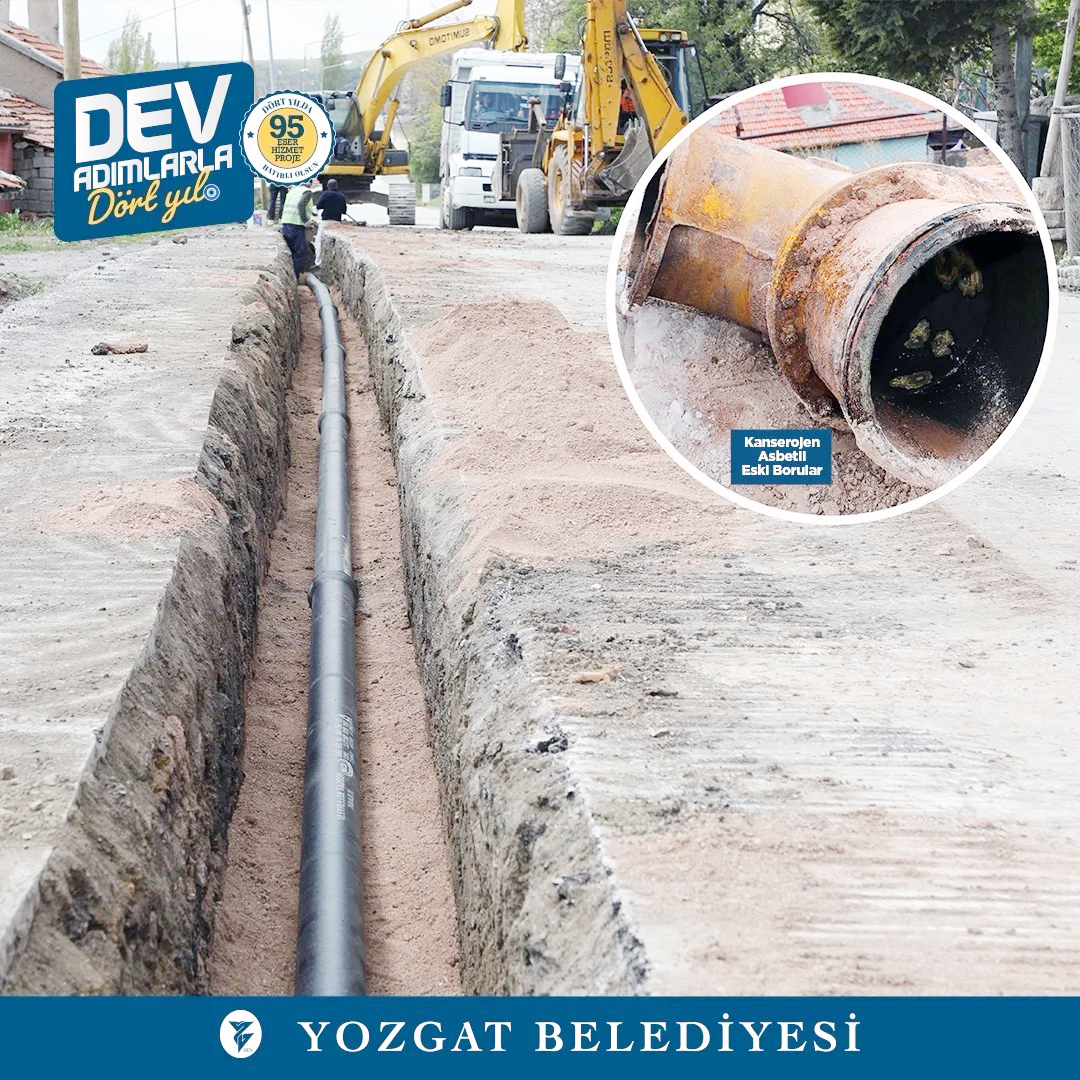 Başlattığımız Büyük Altyapı Yenileme Çalışmaları ile birlikte bu israfın önüne geçeceğiz. En önemlisi de vatandaşımızın sağlığını tehdit eden bu asbestli yani kanserojen borulardan da kurtulmuş olacağız. Daha sağlıklı borulardan su temini sağlayacağız. Yıpranmış ve ömrünü tamamlamış içme suyu hatlarının yenilenmesi ile birlikte yaşanan su arızaları da bu sayede en aza indirilip hemşehrilerimizin hanelerine ulaşan içme suyu kesintilerinin önüne geçilecek. Arıza tamirleri için harcanan iş gücü ve zamandan tasarruf edilecek ve zamanda çalışmalardan dolayı yol, kaldırım gibi bozulan üst yapının tamiri nedeniyle ortaya çıkan kötü görüntü ve maliyet en aza indirilecek.”diye konuştu.