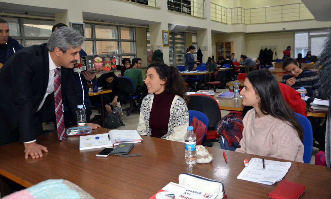 Ders çalışan öğrencilerle sohbet eden Başkan Köse, öğrencilere meyve salatası, not defteri ve kalem hediye etti.