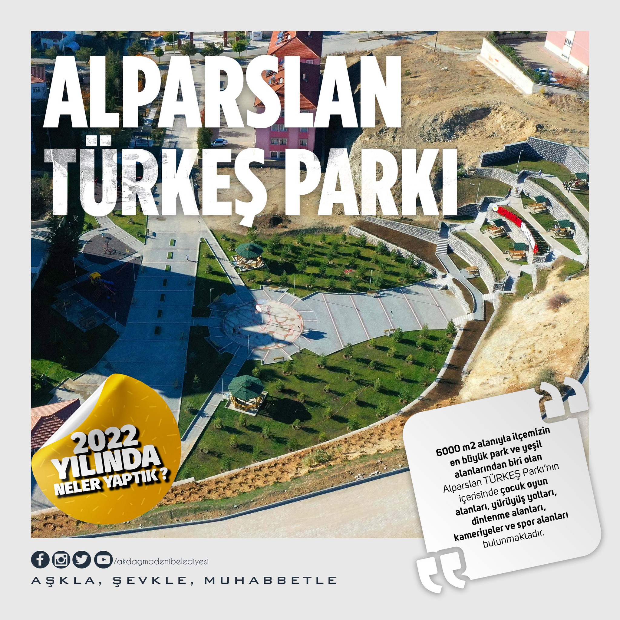 “6000 metrekare alanıyla ilçemizin en büyük park ve yeşil alanlarından biri olan Alparslan TÜRKEŞ Parkı’nın içerisinde çocuk oyun alanları, yürüyüş yolları, dinlenme alanları, kameriyeler ve spor alanları bulunmaktadır.”