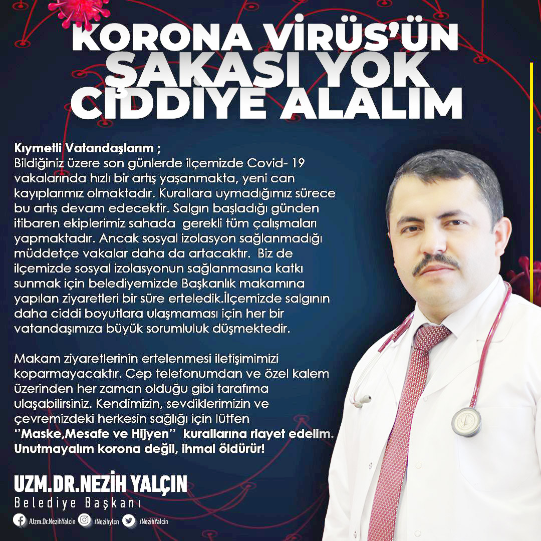 Makam ziyaretlerinin ertelenmesi iletişimimizi koparmayacaktır. Cep telefonumdan ve özel kalem üzerinden her zaman olduğu gibi tarafıma ulaşabilirsiniz. Kendimizin, sevdiklerimizin ve çevremizdeki herkesin sağlığı için lütfen ‘’Maske, Mesafe ve Hijyen’’ kurallarına riayet edelim. Unutmayalım korona değil, ihmal öldürür!