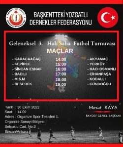 Başkentteki Yozgatlı Dernekler Federasyonu tarafından 3. Halı Saha Futbol Turnuvası 30 Ekim Pazar günü 12 takımın katılımı ile Organize Spor Tesisleri başlıyor.