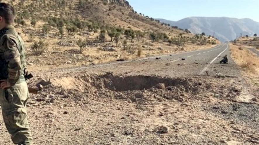Patlamayla birlikte asfalt yolda 1,5 metre derinliğinde 4,5 metre çapında geniş çukurun oluştuğu görüldü. PKK’lı teröristlerin, el patlayıcıyı önceden yola tuzakladığı, kablolu düzenekle uzaktan kumandayla infilak ettirdiği belirlendi.
