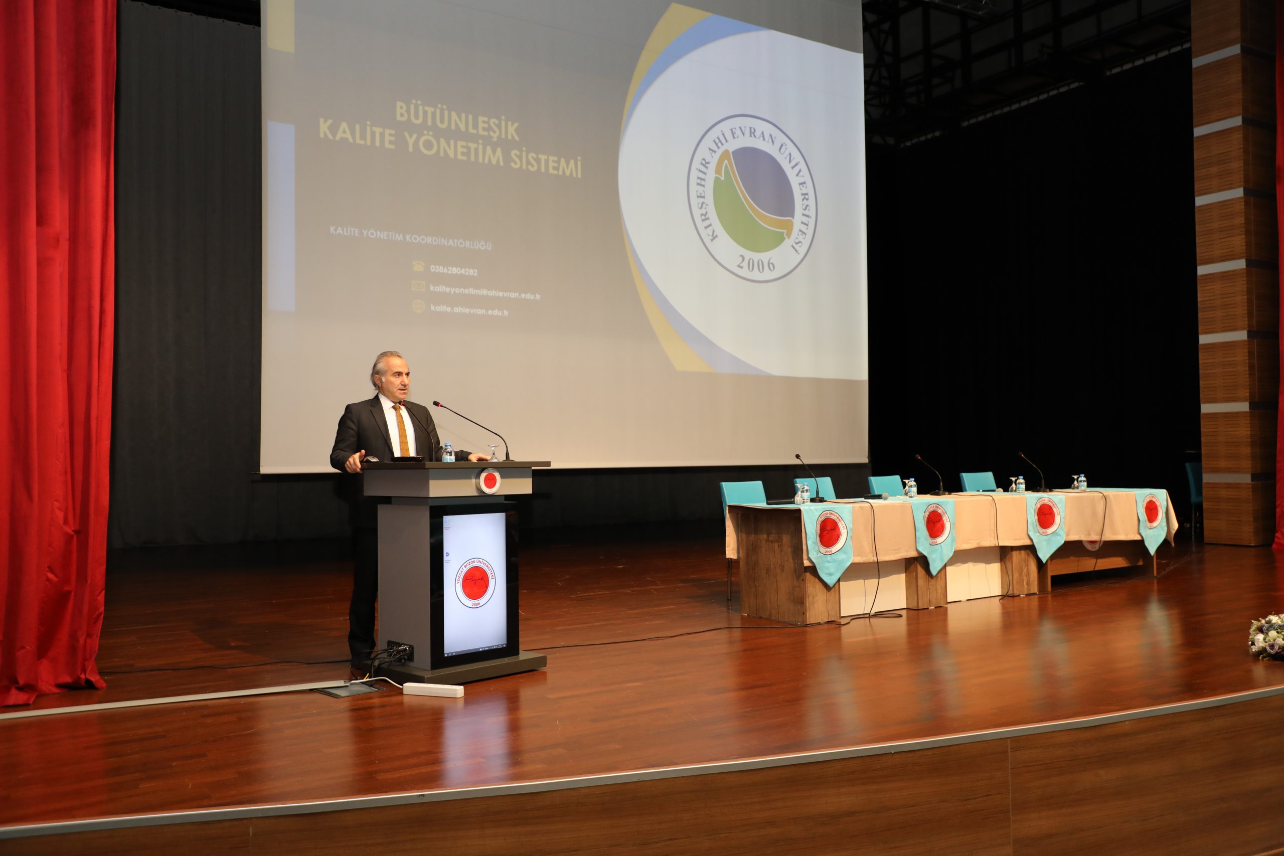 Konuşmaların ardından Ahi Evran Üniversitesi Kalite Koordinatör Yardımcısı Prof. Dr. Hüseyin Şimşek tarafından kalite yönetim sisteminin işleyişi, organizasyonu, komisyonları, çalışma usul ve esasları, birimlere yayılımı hakkında sunum gerçekleştirdi.