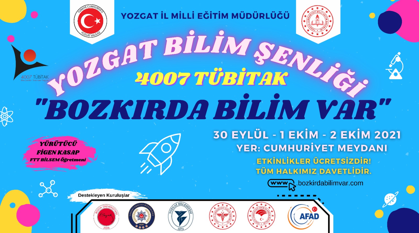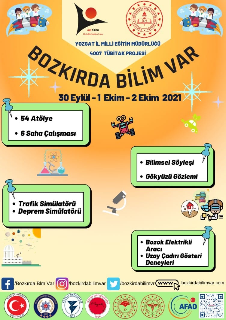 Yozgat İl Milli Eğitim Müdürlüğü’nce hazırlanan ve TUBİTAK tarafından desteklenen ve 53 projeden biri olan “Bozkır’da Bilim Var” projesi etkinliği 30 Eylül Perşembe günü başlayacak ve 3 gün sürecek.