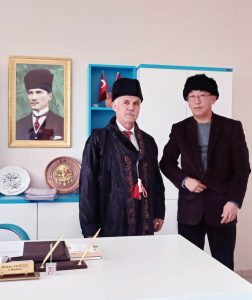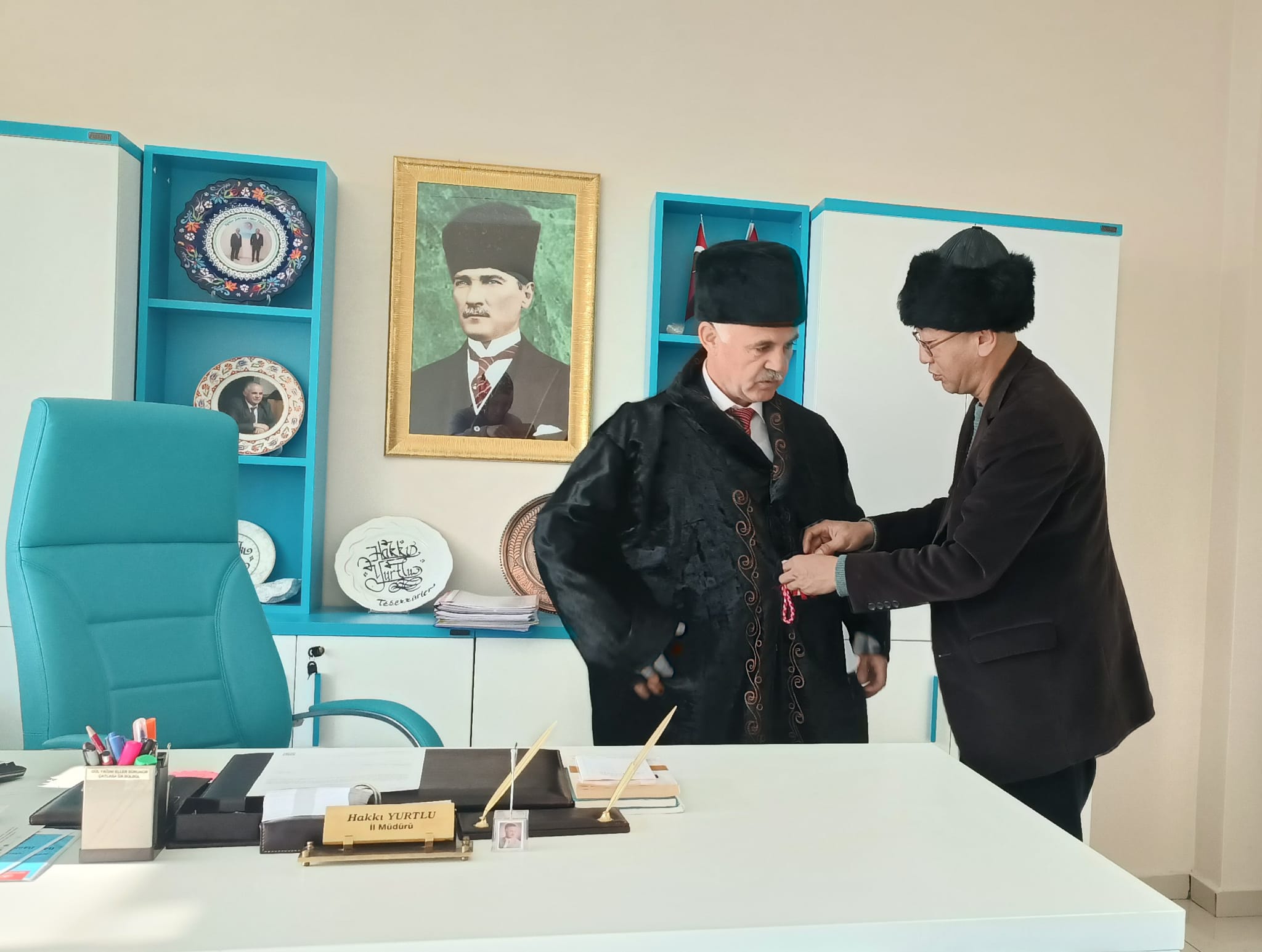 Yenifakılı Kırgızları Kültür ve Sosyal Yardımlaşma Derneği başkanı Gencekul Timur, Yozgat İl Sivil Toplumla İlişkiler Müdürü Hakkı Yurtlu’yu ziyaret ederek, kendilerine özgü giysilerden Çapan giydirip kalpak taktı.