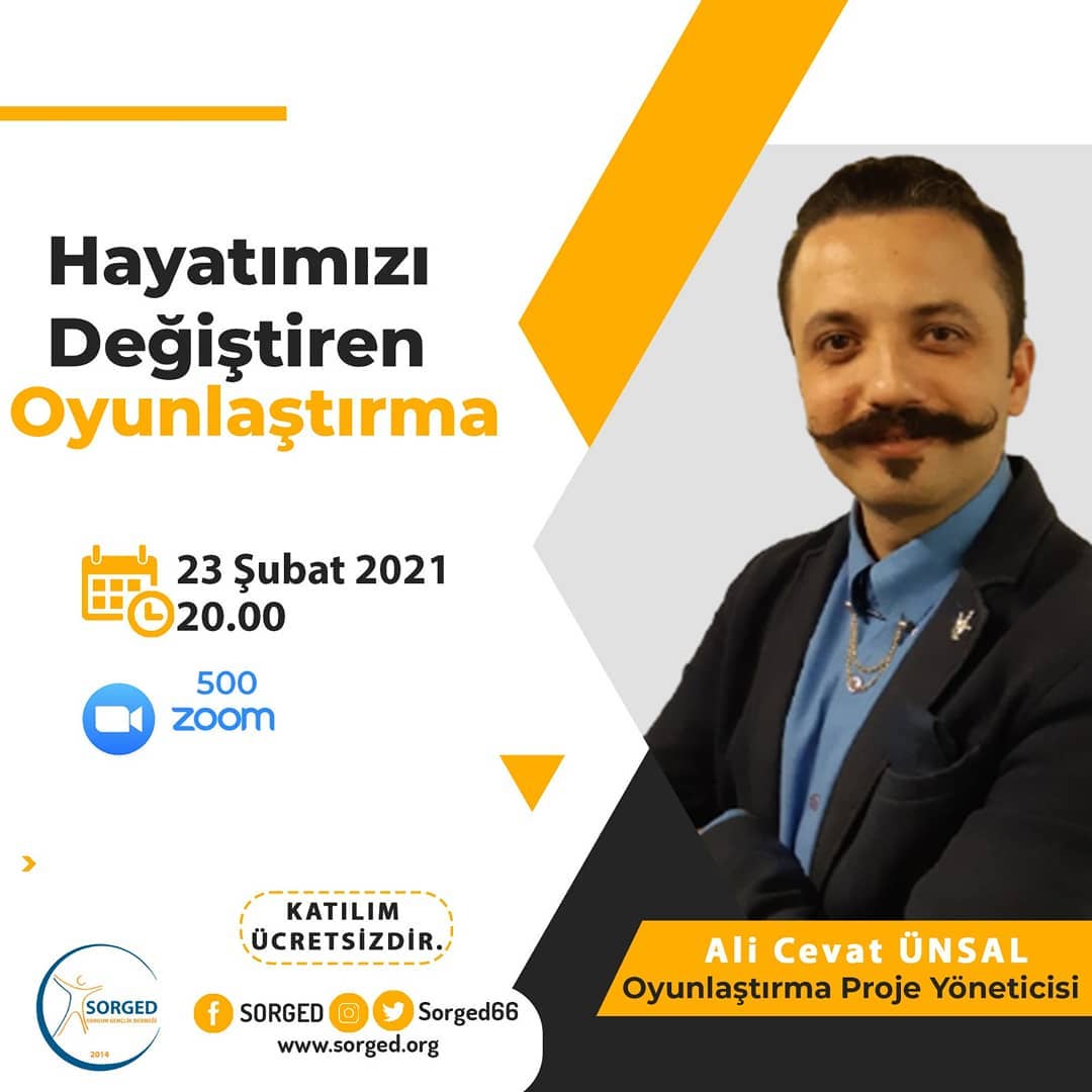Sorgun Gençlik Derneği (SORGED) tarafından Çevrim içi eğitimleri devam ediyor. 23 Şubat 2021 (bugün) düzenlenecek olan çevrim içi eğitimlerinin konuğu Oyunlaştırma Proje Yöneticisi Ali Cevat Ünsal konuk olacak.