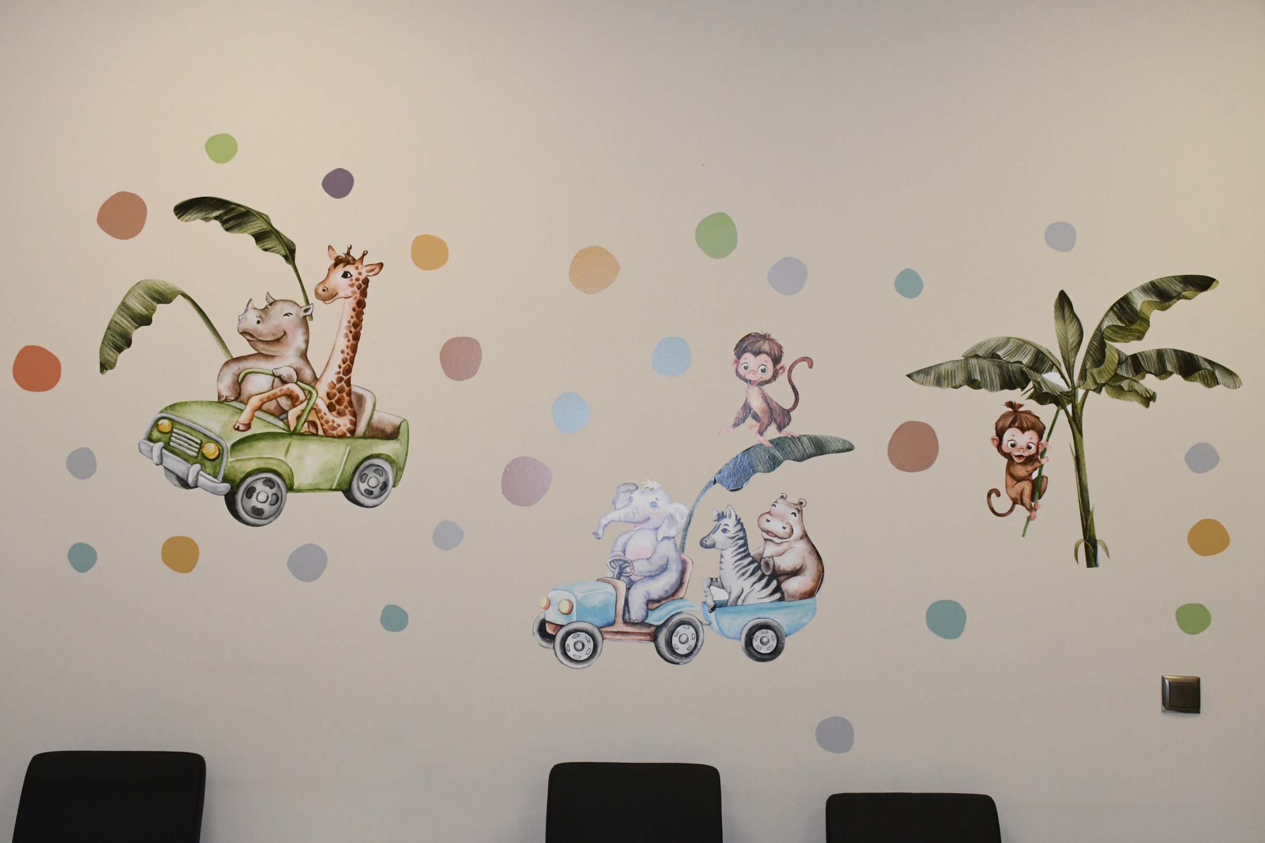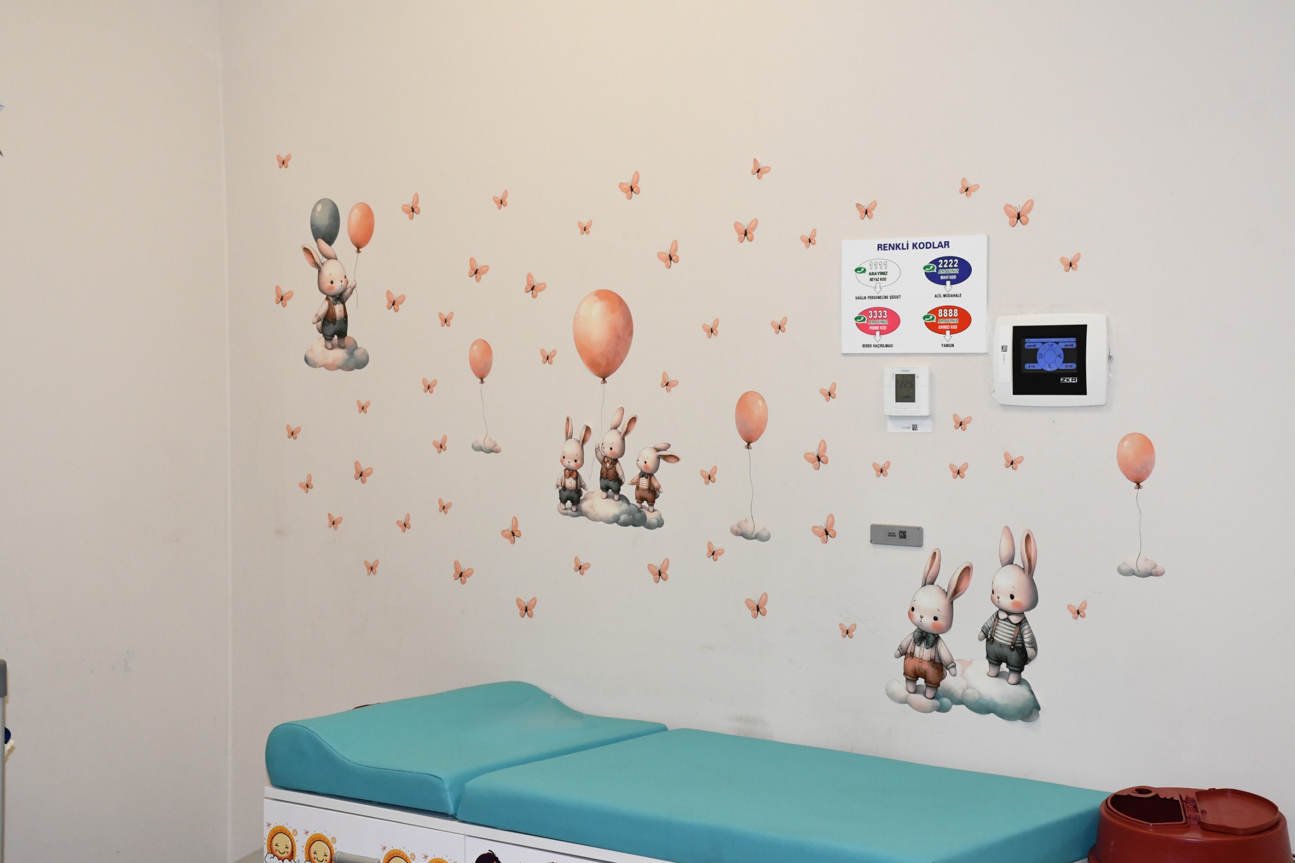 Çocuklar için özel olarak tasarlanan duvar süslemeleri, sevimli hayvanlar, çizgi film kahramanları ve pastel tonlardaki renkli görsellerle donatıldı.