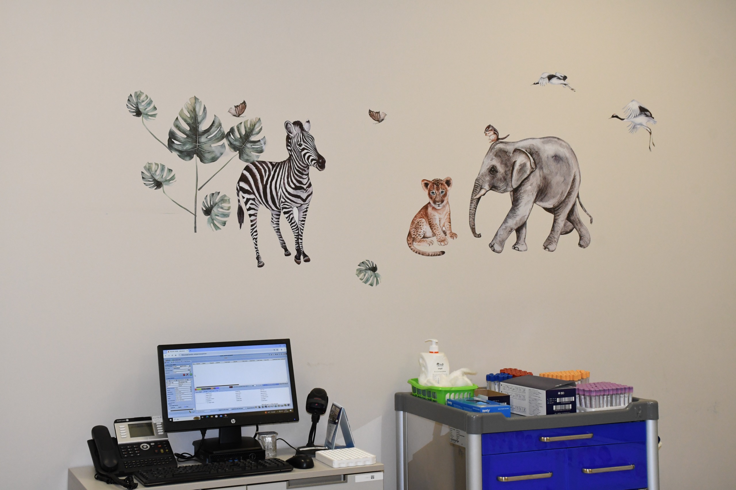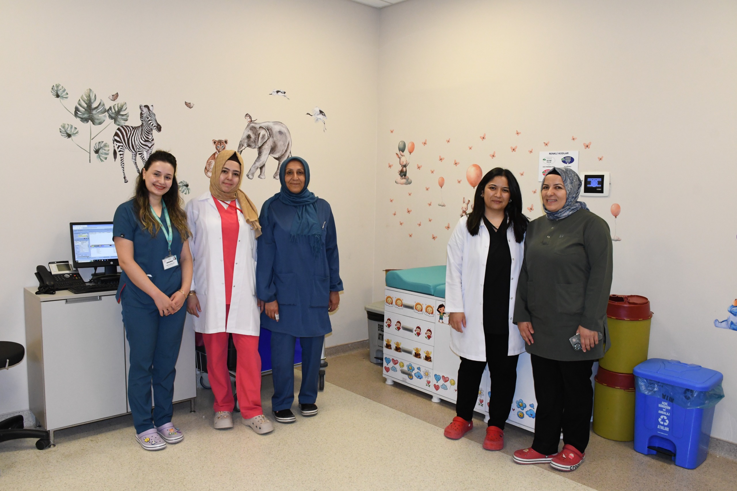 Çocuk Numune Alma Ünitesi, renkli duvar görselleri ve çizgi film karakterleriyle süslenerek, çocuklar için daha sıcak ve eğlenceli bir ortama dönüştürüldü.
