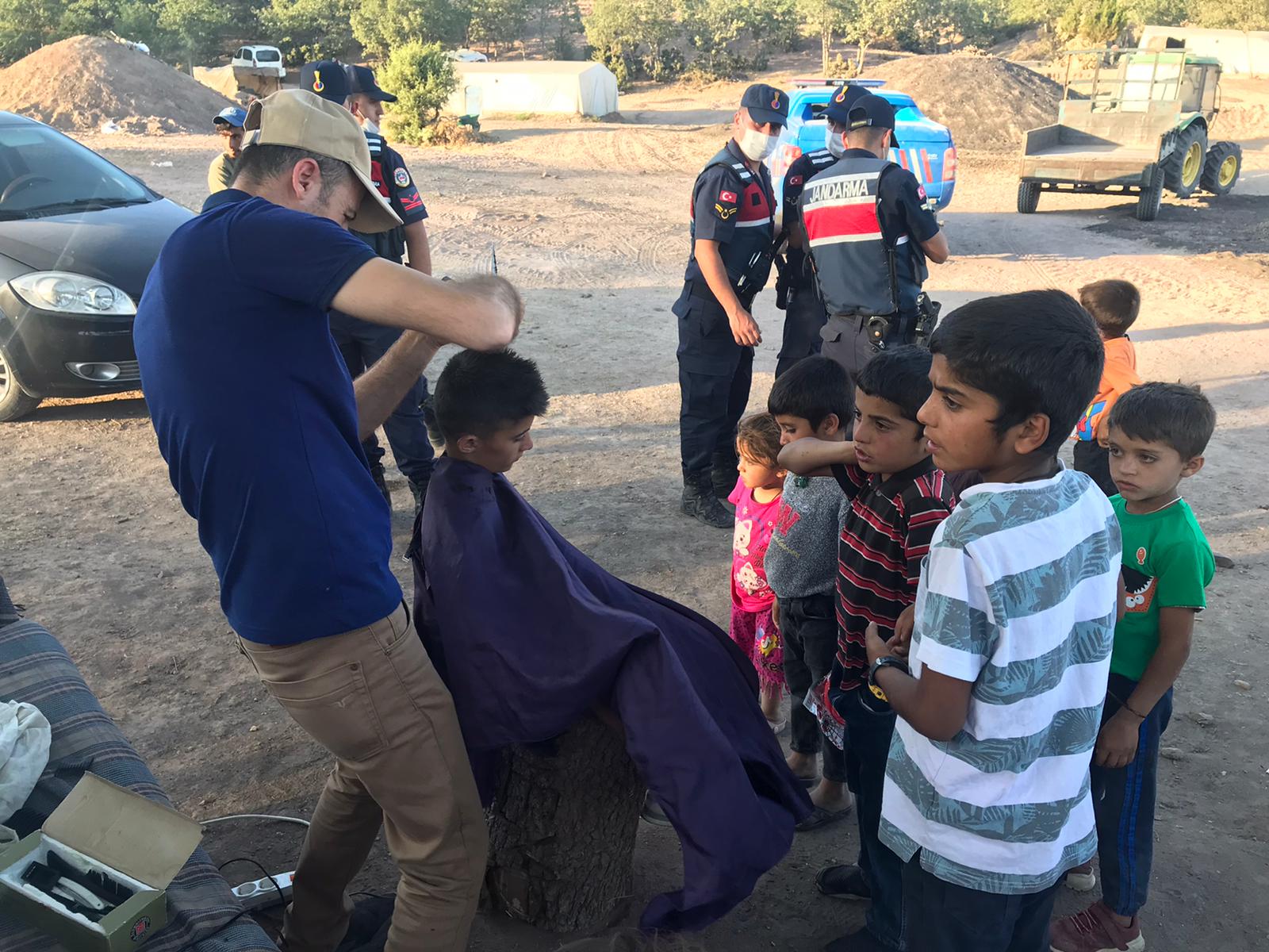 Tarım işçilerinin kaldığı çadırları ziyaret eden dernek üyeleri, çocuklara çeşitli hediyeler verirken, yardımlara destek olan Saraykent İlçe Jandarma Komutanlığı ekipleri de çocukları tıraş etti.