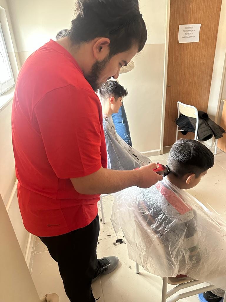 Sarıkaya İlçe Milli Eğitim Müdürlüğü tarafından misafir edilen depremzede ailelere Sarıkaya Mesleki Eğitim Merkezi berber ve kuaförlük öğrencileri saç bakımı yaptı.