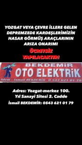 Yozgat 100 Yıl Sanayisinde uzun yıllar Oto Elektrik üzerine faaliyetini sürdüren İsmail Bekdemir, deprem bölgelerinden gelen vatandaşların ücretsiz olarak araçlarının bakımını yapacağını ifade etti. Bekdemir, “Depremin yaralarının sarılması için ülke olarak devletimiz ve milletimiz herkes elinden gelen yardım ve katkıyı sürdürüyor. Bu kapsamda bende depremzedelerimizin araçlarının bakım ve onarımını ücretsiz olarak yaparak buradaki depremzedelerimize destek olmak istiyorum. Ülke olarak bütün herkes seferber olmuş durumda. Bugünleri de birlik beraberlik içerisinde dayanışma ile inşallah hep birlikte atlatacağız.” diye konuştu. Bekdemir, depremzedelerin tamir gerektiren araçlarını 100. Yıl Sanayi Sitesi 2. Cadde üzerindeki Bekdemir Oto Elektrik’e beklediklerini ifade etti. / Nazife EKİCİ