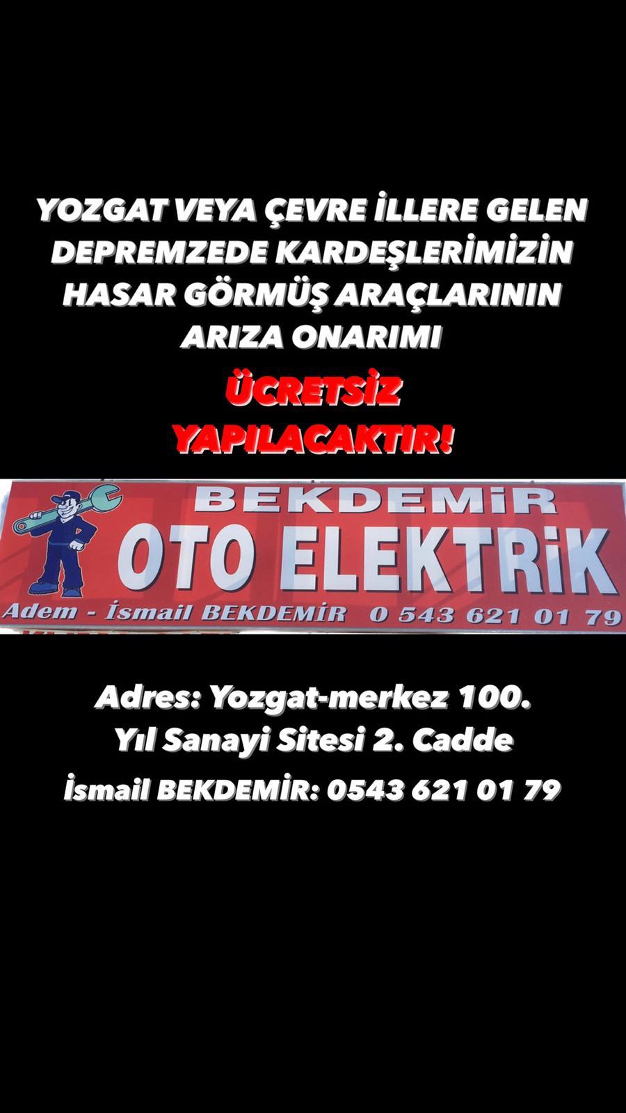 Yozgat’ta Bekdemir Oto Elektrik firma sahibi İsmail Bekdemir, deprem bölgelerinden ilimize gelen depremzedelerin araçlarının bakım ve onarımını ücretsiz olarak yapacaklarını söyledi.