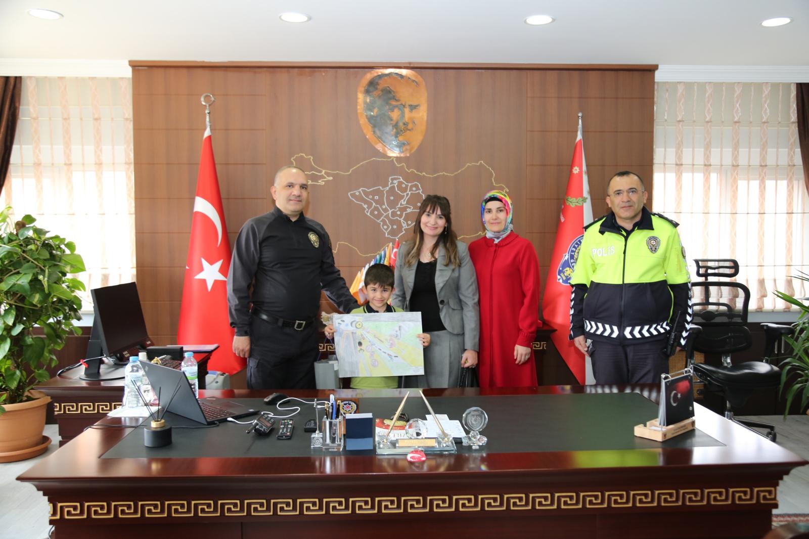 Yozgat İl Millî Eğitim Müdürlüğü ve İl Emniyet Müdürlüğü iş birliğiyle düzenlenen “Trafikte Kurallar” konulu resim yarışmasında dereceye giren öğrenciler, ödüllerini almak üzere İl Milli Eğitim Müdürü İsmail Altınkaynak ve Şube Müdürü Yasin Gürsoy ile birlikte İl Emniyet Müdürü Recep Tecimer’i makamında ziyaret etti.