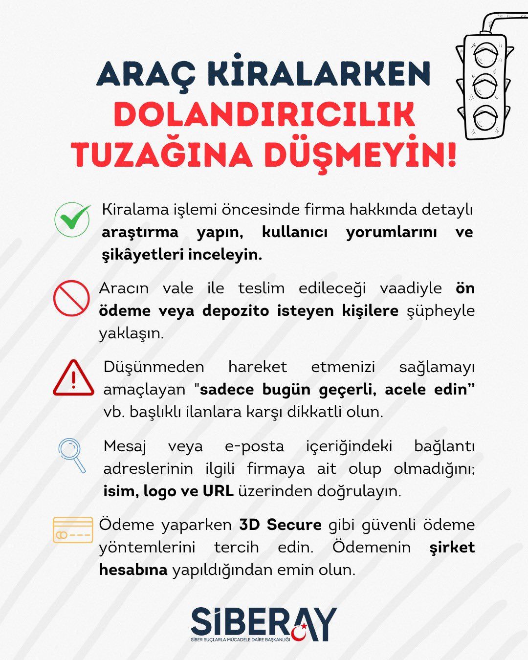 Yozgat İl Emniyet Müdürlüğü, son dönemde artan dolandırıcılık girişimlerine karşı vatandaşları araç kiralama işlemleri konusunda dikkatli olmaları yönünde uyardı. Özellikle internet ve sosyal medya üzerinden yapılan sahte ilanlarla mağduriyetlerin arttığına dikkat çekildi.