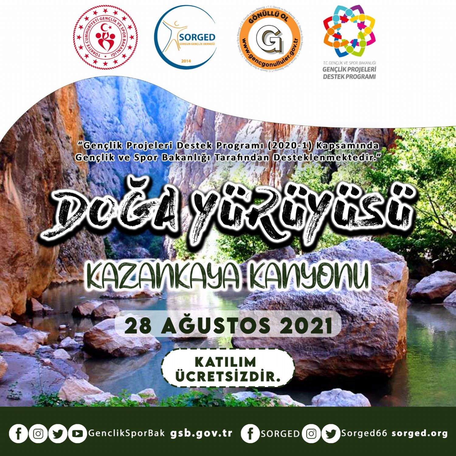 Gençlik Projeleri Destek Programı (2020-1) kapsamında Gençlik ve Spor Bakanlığı tarafından desteklenen, Sorgun Gençlik Derneği koordinatörlüğünde ve Sorgun Gençlik Merkezi işbirliğinde yürütülen “Genç Değişim, Genç Gelişim” başlıklı proje çerçevesinde Aydıncık Kazankaya Kanyonunda “Doğa Yürüyüşü” düzenlenecek.