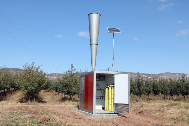 4 yıl önce yaptıkları araştırma sonucunda bir dolu topu ithal ettiklerini ve faydasını gördükten sonra ise bir firma tarafından üretilen 3 dolu topu daha aldıklarını anlatan Aksakal, “Firmadan biz dolu toplarını alıyoruz. Aynı zamanda Ankara’da bir başka bir yerli firmamız da arazimizin etrafında bize yaklaşmakta olan dolu bulutlarını tespit edip erken uyarı sistemi olarak hem cep telefonlarımıza mesaj gönderiyor ve mail atıyor hem de dolu makinalarına mesaj atıp dolu makinalarının otomatik olarak çalışmasını sağlıyor. Böylece Van’dan getirttiğimiz dolu makinalarıyla Ankaralı firmanın sunduğu erken uyarı sistemi birleştiğinde bir dolu kalkanı olarak bahçenin üstünde koruyan bir sistem haline gelmiş oluyor” dedi.