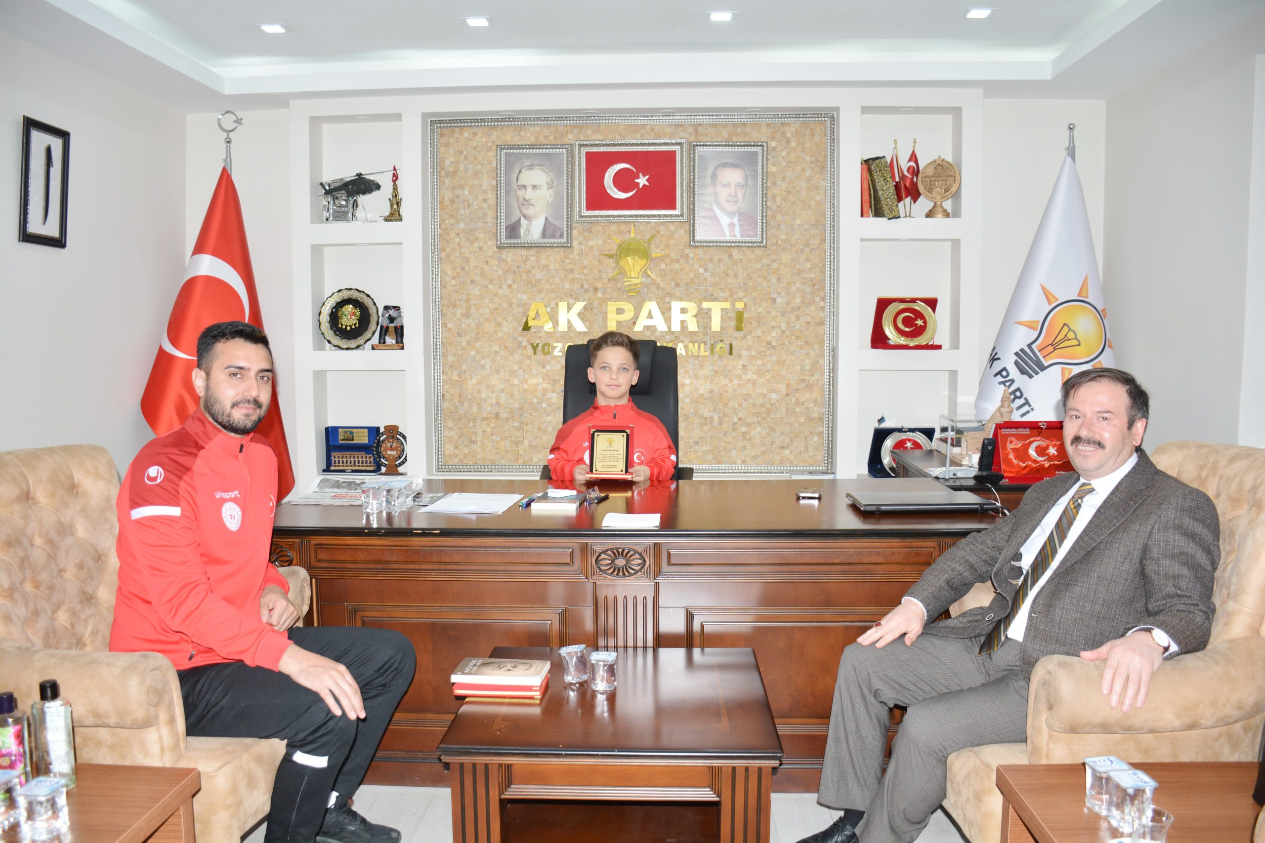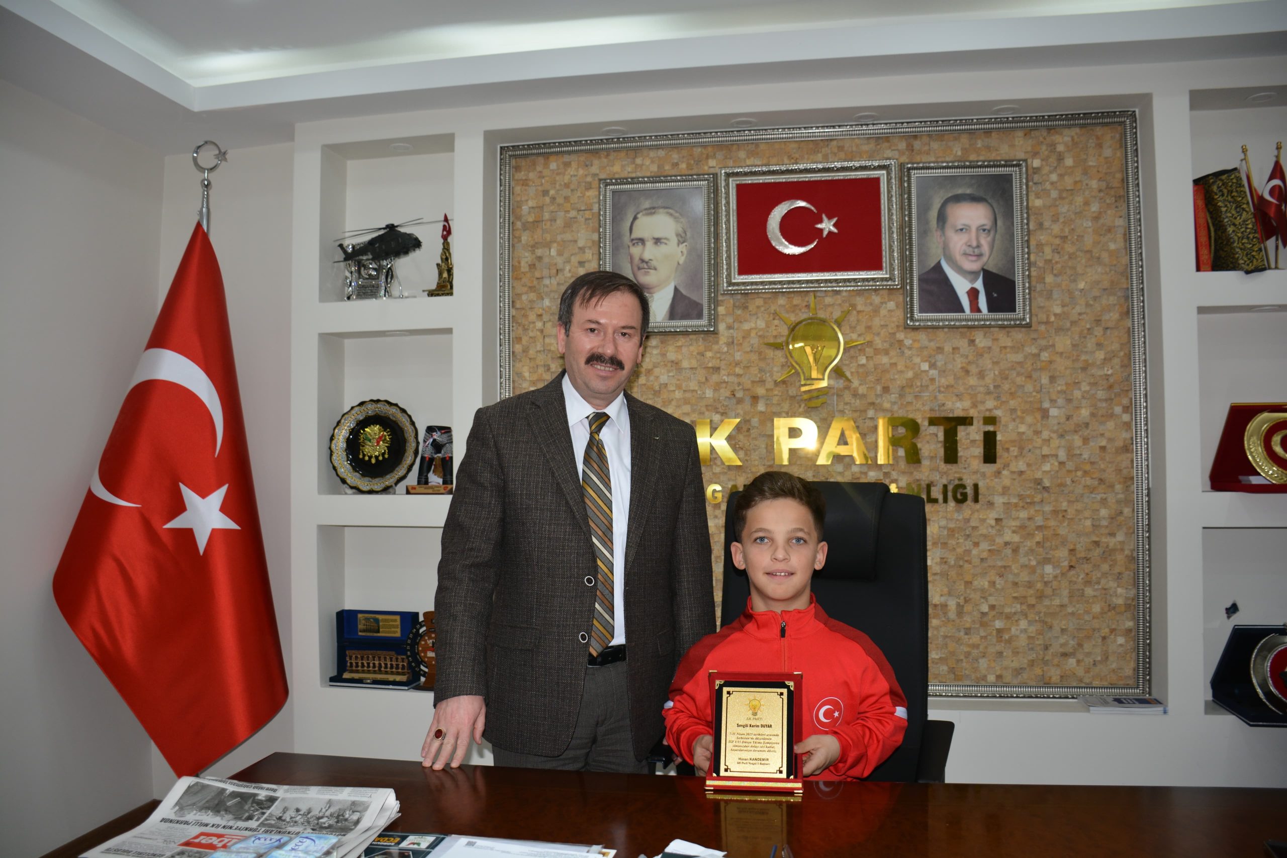AK Parti Yozgat İl Başkanı Hasan Kandemir, Sırbistan’ın Zlabitor kentinde düzenlenen ISF U15 Yıldızlar Dünya Şampiyonası’nda Kurbağalama Stil kategorisinde dünya şampiyonu olan Yozgatlı milli yüzücü Kerim Duyar’ı makamında ağırlayarak tebrik etti.