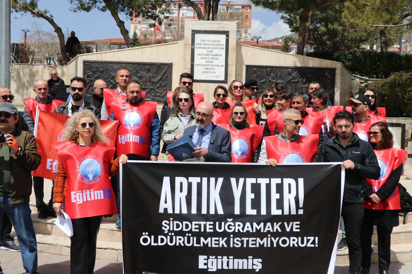 Eğitim Bir Sen Yozgat Şube Başkanı Kenan Şerefli, sendika üyelerinin katılımıyla yaptığı açıklamada eğitim kurumlarının giderek şiddetin hedefi haline geldiğini belirterek, “Artık yeter, susmayacağız” mesajı verdi. Şerefli, okullarda güvenliğin sağlanması için okul polisi uygulamasının hayata geçirilmesi ve rehberlik hizmetlerinin güçlendirilmesi gerektiğini ifade etti.