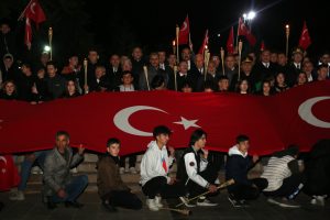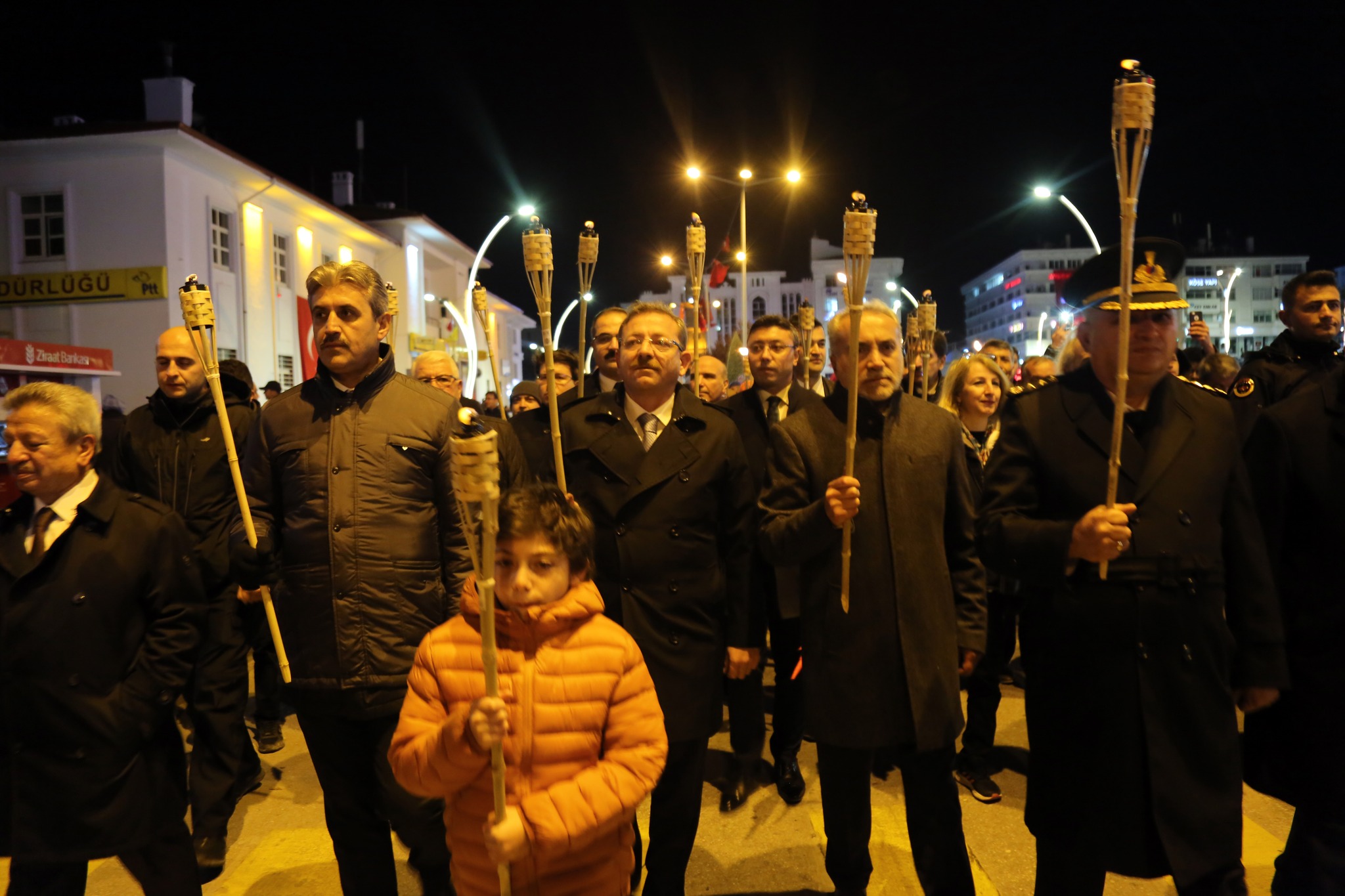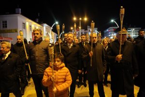 Cumhuriyet Meydanı’nda bir araya gelen vatandaşlar, ellerinde dev Türk bayrakları, Atatürk’ün fotoğrafları ve meşalelerle Kent Park önüne kadar yürüdü. Bando ve meşale eşliğinde gerçekleştirilen kortej yürüyüşü, renkli görüntülere sahne oldu. Fener alayına Yozgat Valisi Ziya Polat, Belediye Başkanı Celal Köse, Cumhuriyet Başsavcısı Recep Sevgili, Yozgat İl Emniyet Müdürü Murat Esertük, Bozok Üniversitesi Rektörü Prof. Dr. Ahmet Karadağ, İl Jandarma Alay Komutanı Albay Halil Başer, kurum müdürleri ve çok sayıda vatandaş katıldı.