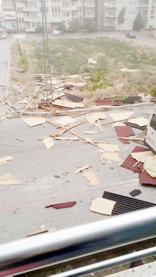 Yozgat’ın Yerköy ve Şefaatli ilçelerinde kısa süreli kum fırtınası etkili oldu. Şefaatli ilçe merkezini toz bulutu kaplarken, Yerköy’de ise etkili olan fırtına, Erzurum ve 60 Evler Mahallelerinde evlerin çatılarının uçmasına neden oldu.Fırtınada kopan çatının büyük bir parçası tehlikeli anlar yaşanmasına neden oldu. Çatıdan kopan parça park halindeki arabanın hemen yanına düşerken bu anı bir vatandaş cep telefonu kamerasıyla anbean kaydetti.