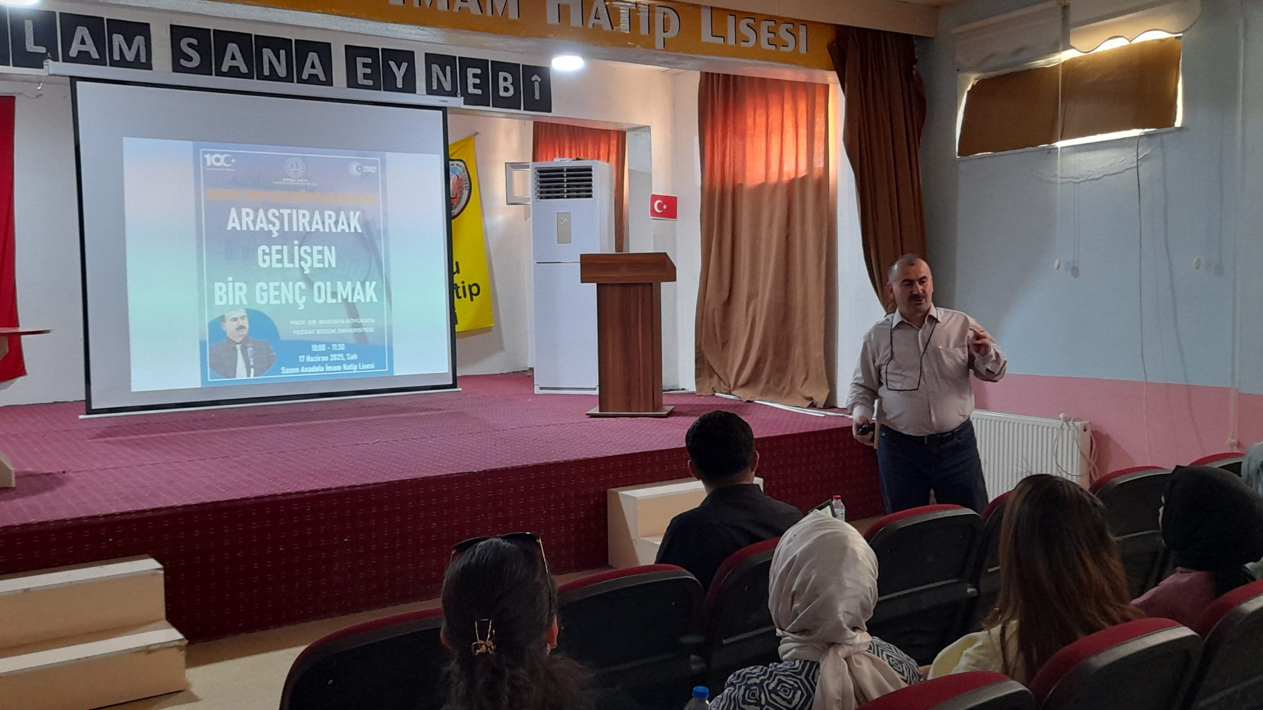 Prof. Dr. Mustafa Böyükata ise planlandığı üzere ziyaret ettiği Sason Anadolu İmam Hatip Lisesi’nde öğretmenlere hitap etti ve “Araştırarak Gelişen Bir Genç Olmak” başlıklı sunumunda geçmişte temel bilimler alanında yapılan öncü çalışmaların bu gün yaşanan ilerlemeleri nasıl tetiklediğini örneklerle ortaya koydu. Etkileşimli bir yolla bilim okuryazarlığı, teknoloji okuryazarlığı gibi konularda tartışmalar açan Prof. Dr. Mustafa Böyükata, araştırma ve eleştirme kültürünü öğrencilerde daha aktif kılmanın gerekliliğini ve yollarını anlatıp proje tabanlı çalışmaların yaygınlaştırılmasının gerektiğini vurguladı ve TÜBİTAK programları hakkında da bilgiler verdi.