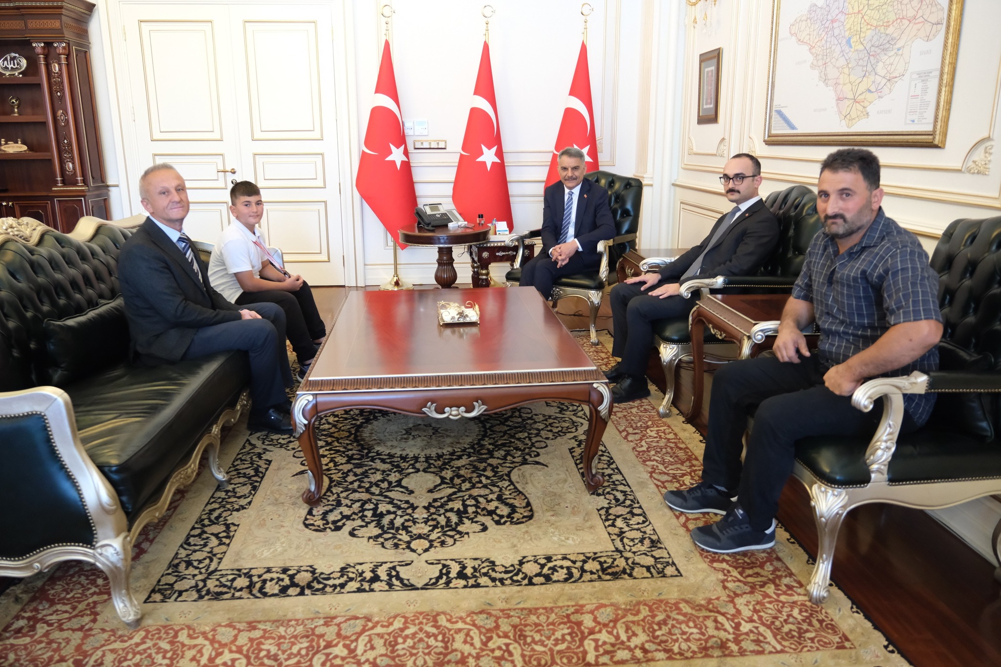 Ziyarette Şefaatli Kaymakamı Oğuzhan Yazar, İlçe Milli Eğitim Müdürü Oğuzhan Gülhan ve genç sporcunun babası da hazır bulundu. Hamza Gül’ün bu başarısının, Yozgat’taki gençlere ilham kaynağı olması bekleniyor. / Haber Merkezi