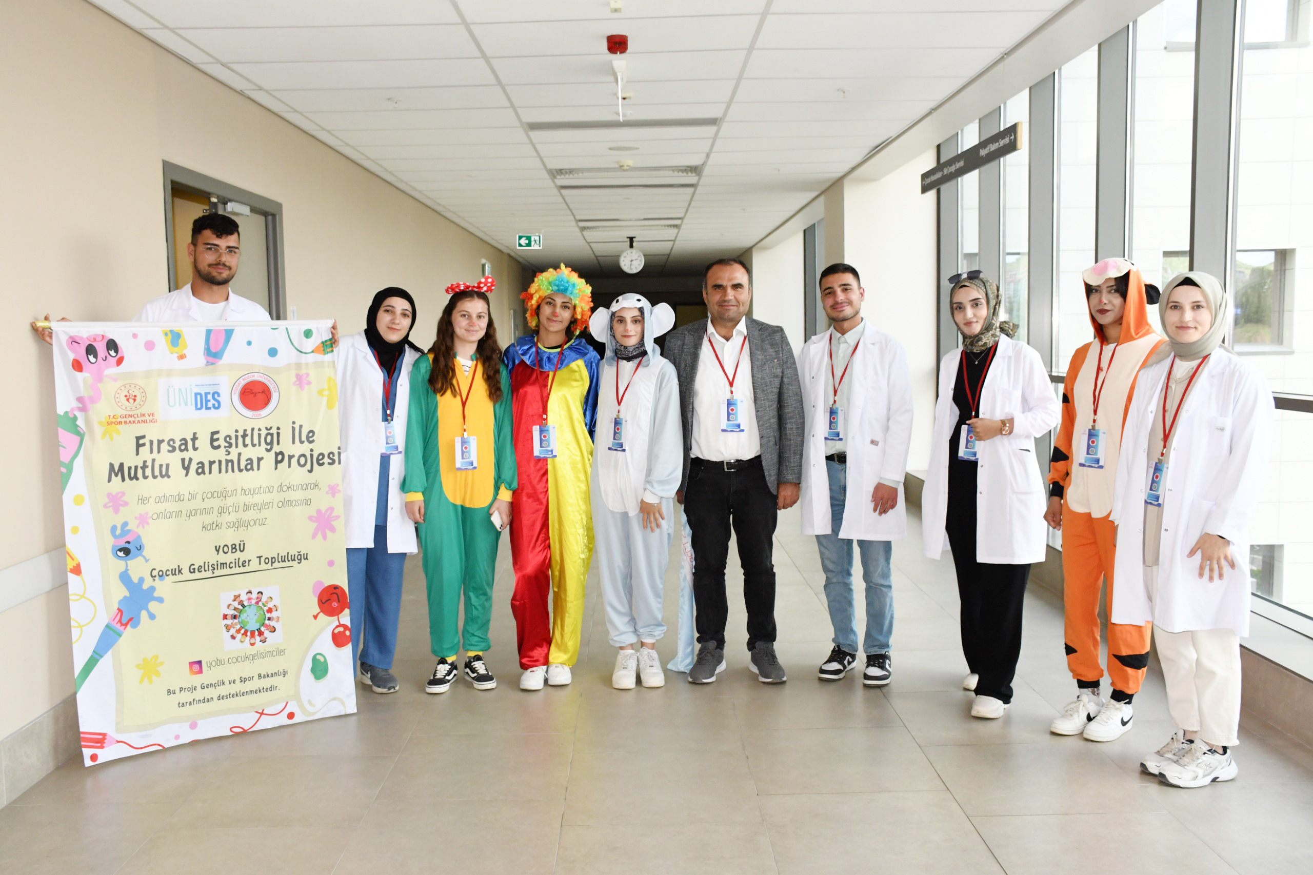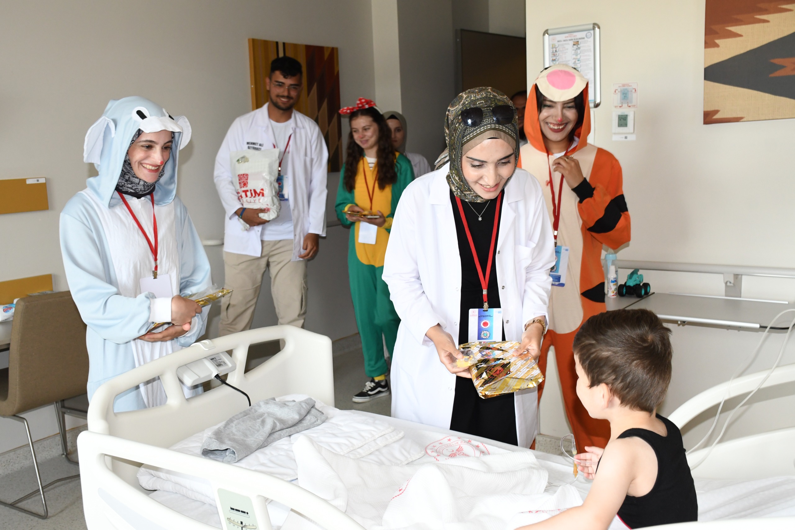 Etkinlik çerçevesinde, YOBÜ öğrencileri Şehir Hastanesi’nin süt çocuğu servisi ve çocuk polikliniğinde yatan çocuklara çeşitli hediyeler takdim etti. Bazı öğrenciler, çocukların hayranı olduğu çizgi film karakterlerinin kostümlerini giyerek oyunlar oynadı, şarkılar söyledi. Miniklerin yüzlerinde tebessüm oluşturan bu anlar, hem çocuklar hem de aileleri için unutulmaz birer hatıraya dönüştü.