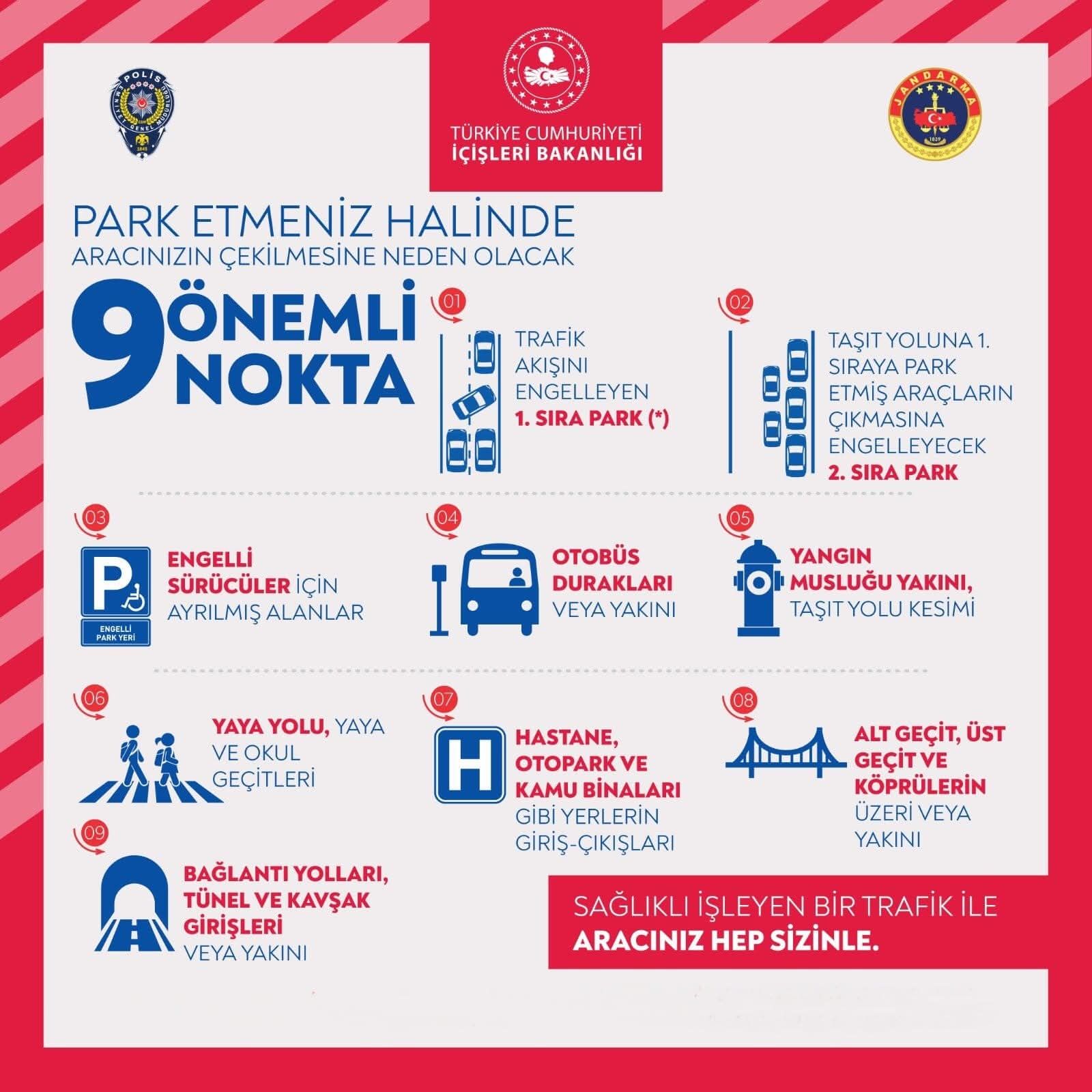 Valilik, hatalı park yapılması halinde hem trafik akışının olumsuz etkileneceğini hem de araçların çekilebileceğini vurgulayarak, şu alanlarda park yapılmaması gerektiğini hatırlattı: