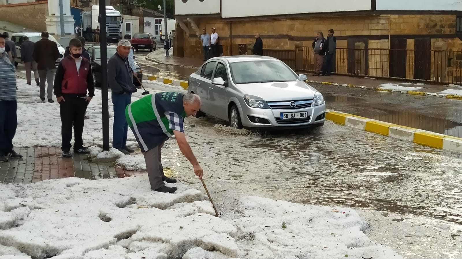 Yozgat’ta dün akşam saatlerinde etkili olan yağmur ve dolu, hayatı olumsuz etkiledi. Birçok ev ve iş yeri sular altında kalırken, bir vatandaşın yağmur altında sabun ve fırça ile aracını yıkaması dikkat çekti.
